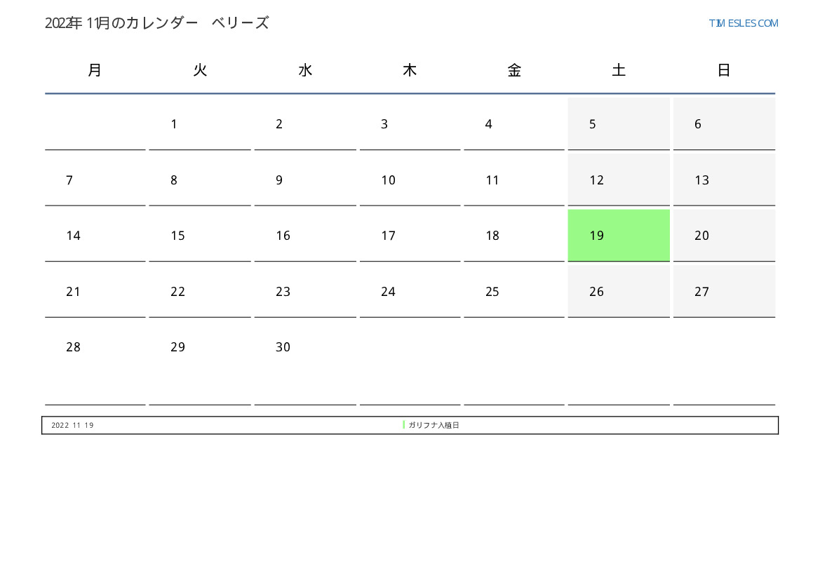 ベリーズのために2022年11月の休日と週末のPDFカレンダーをダウンロードして印刷します