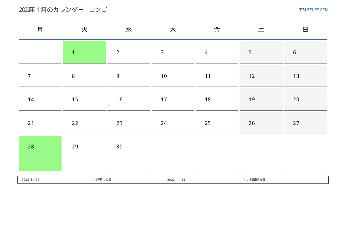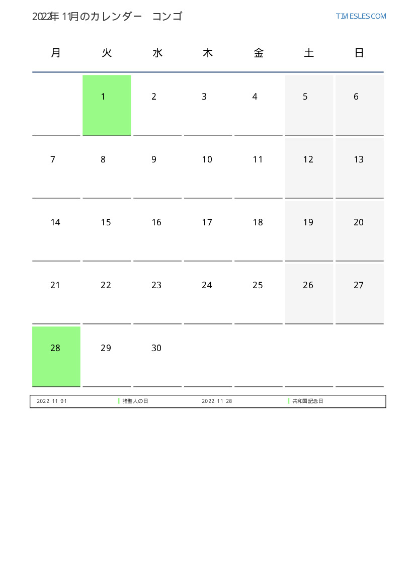 コンゴのために2022年11月の休日と週末のPDFカレンダーをダウンロードして印刷します