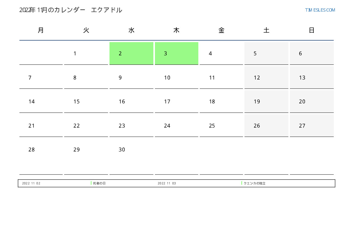 エクアドル向け2022年11月の休日と週末のカレンダー