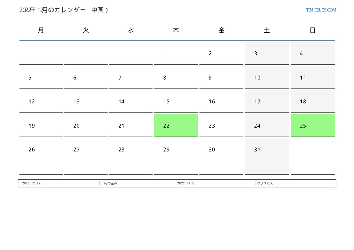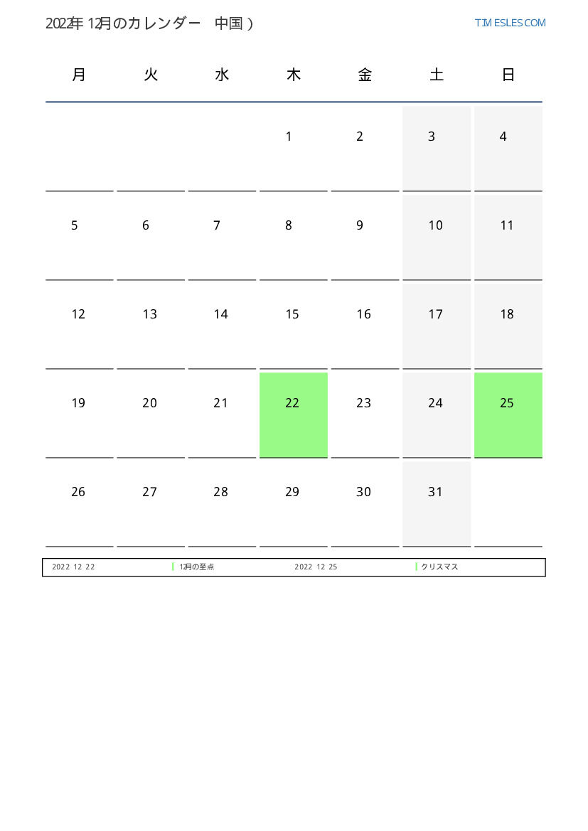 中国向け2022年12月の休日と週末のカレンダー
