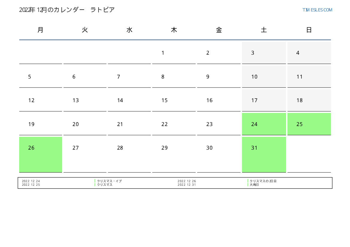 ラトビア向け2022年12月の休日と週末のカレンダー