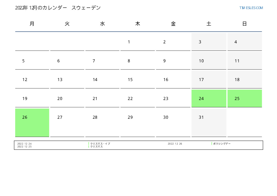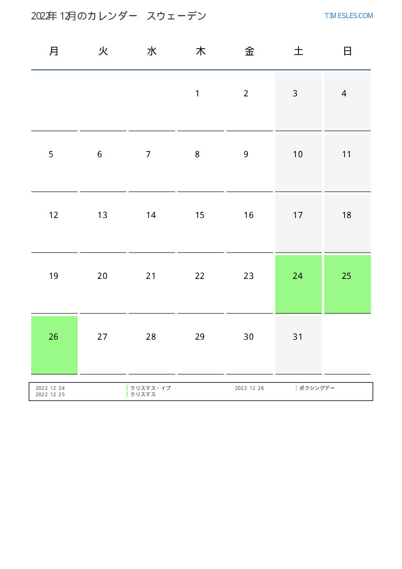 スウェーデン向け2022年12月の休日と週末のカレンダー