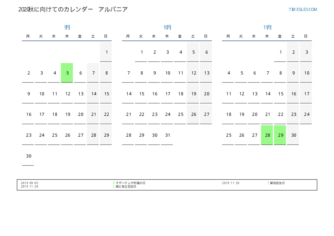 アルバニアの場合2019秋に向けての休日と週末のカレンダー