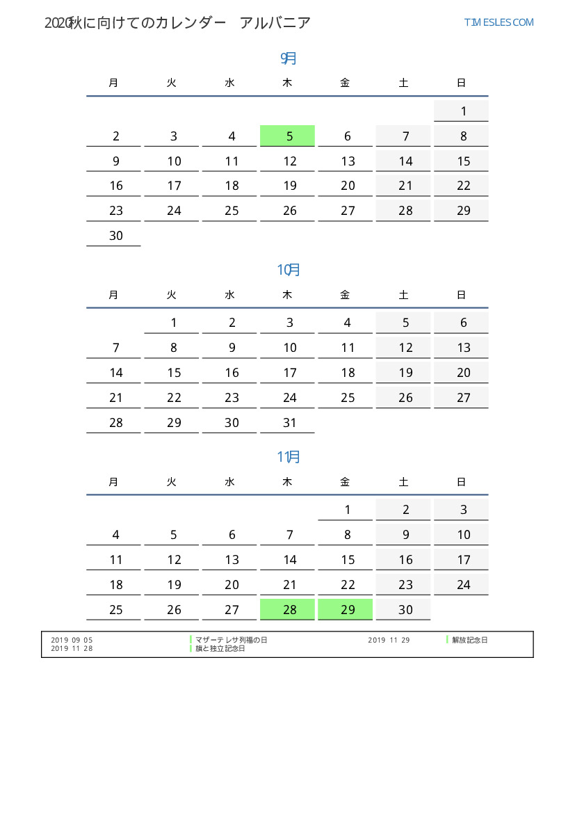 アルバニアの場合2019秋に向けての休日と週末のPDFカレンダーをダウンロードして印刷します