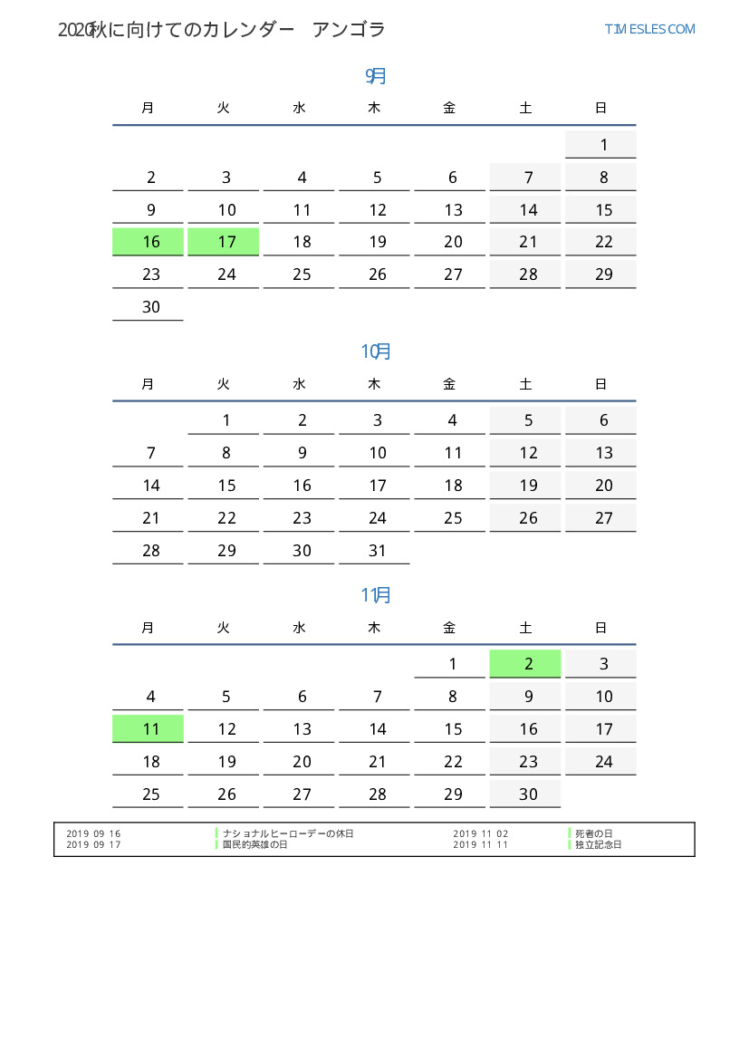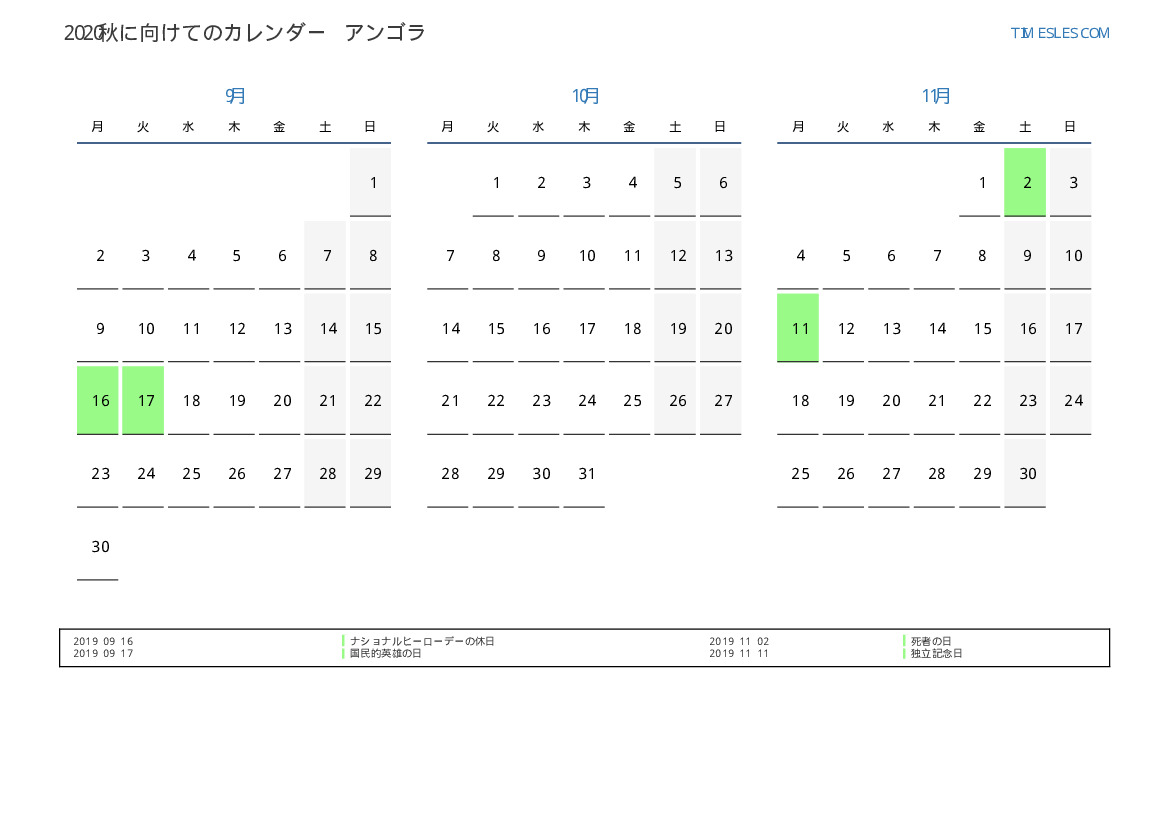 アンゴラ向け2019秋に向けての休日と週末のカレンダー
