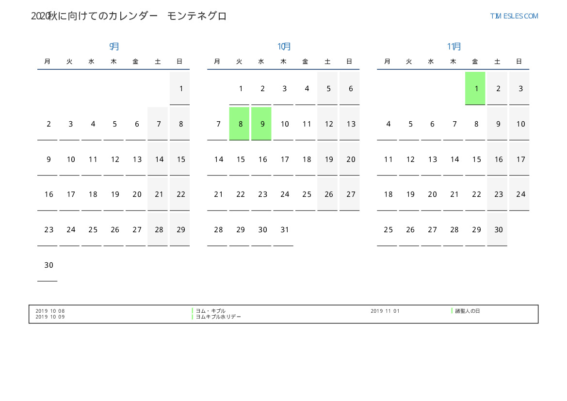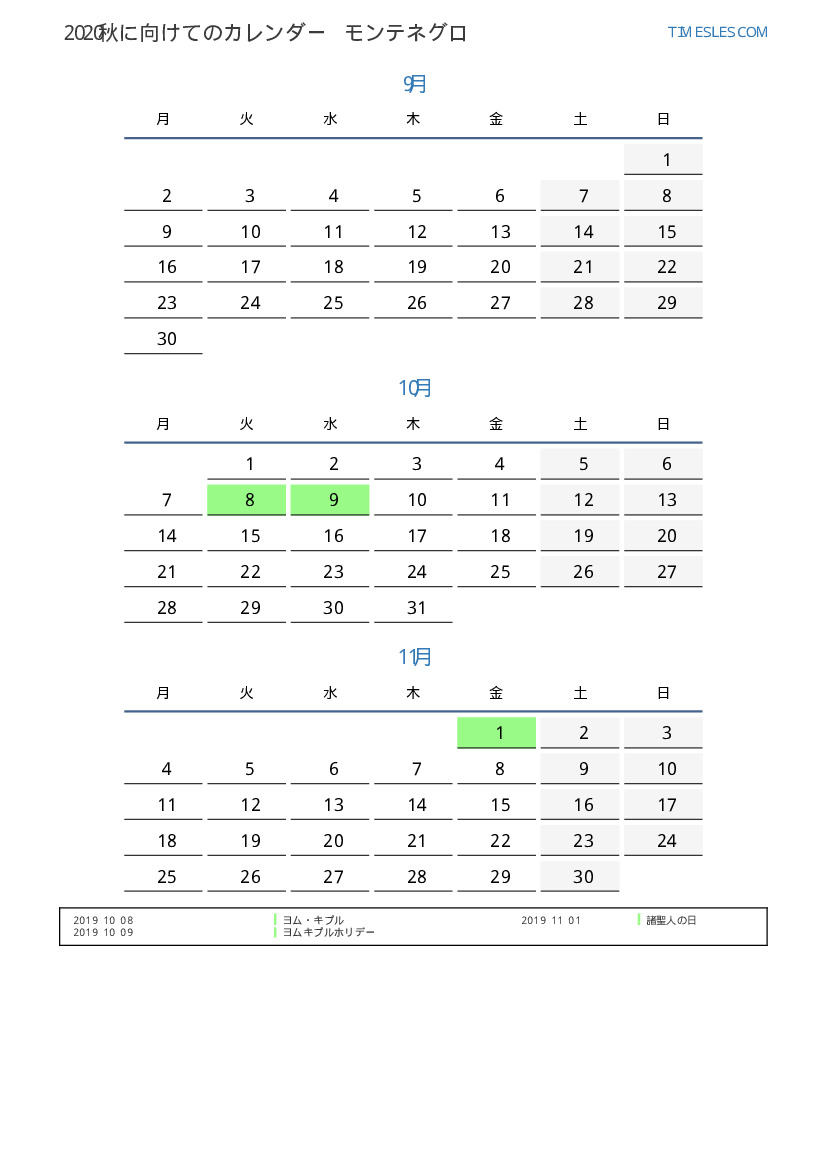 モンテネグロ向け2019秋に向けての休日と週末のカレンダー