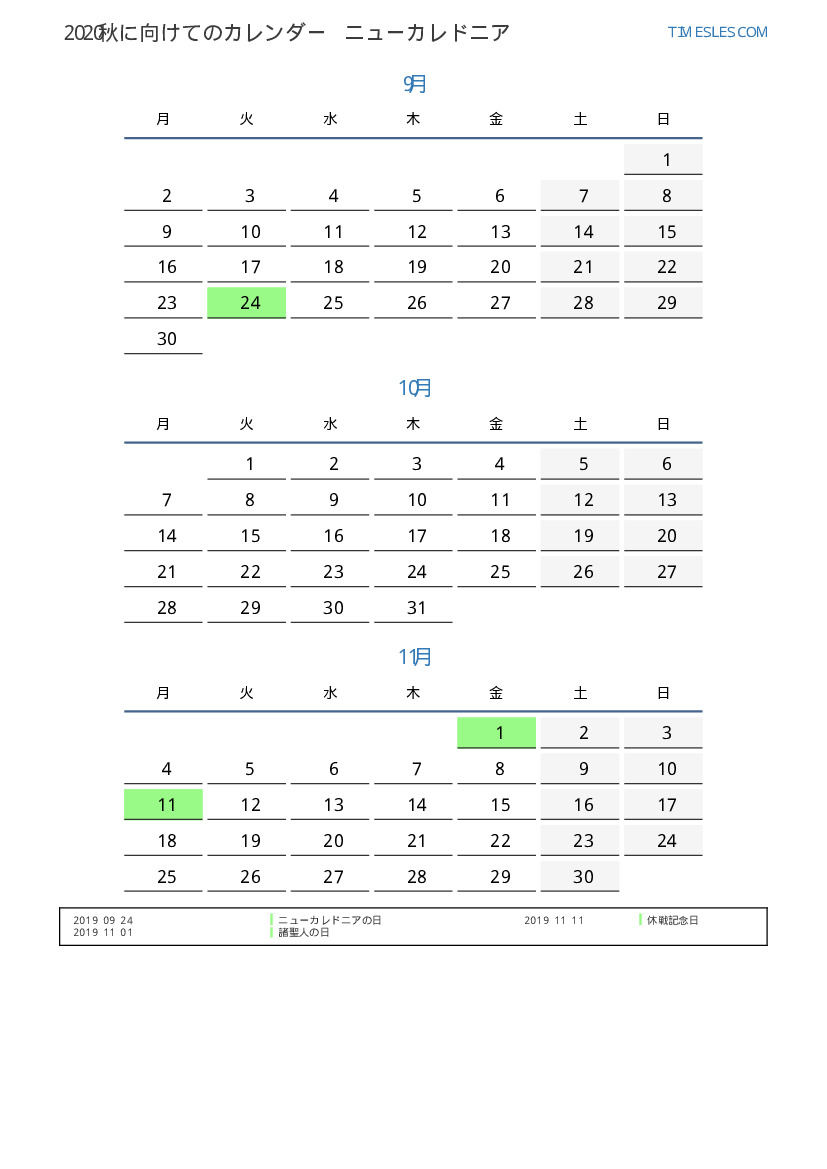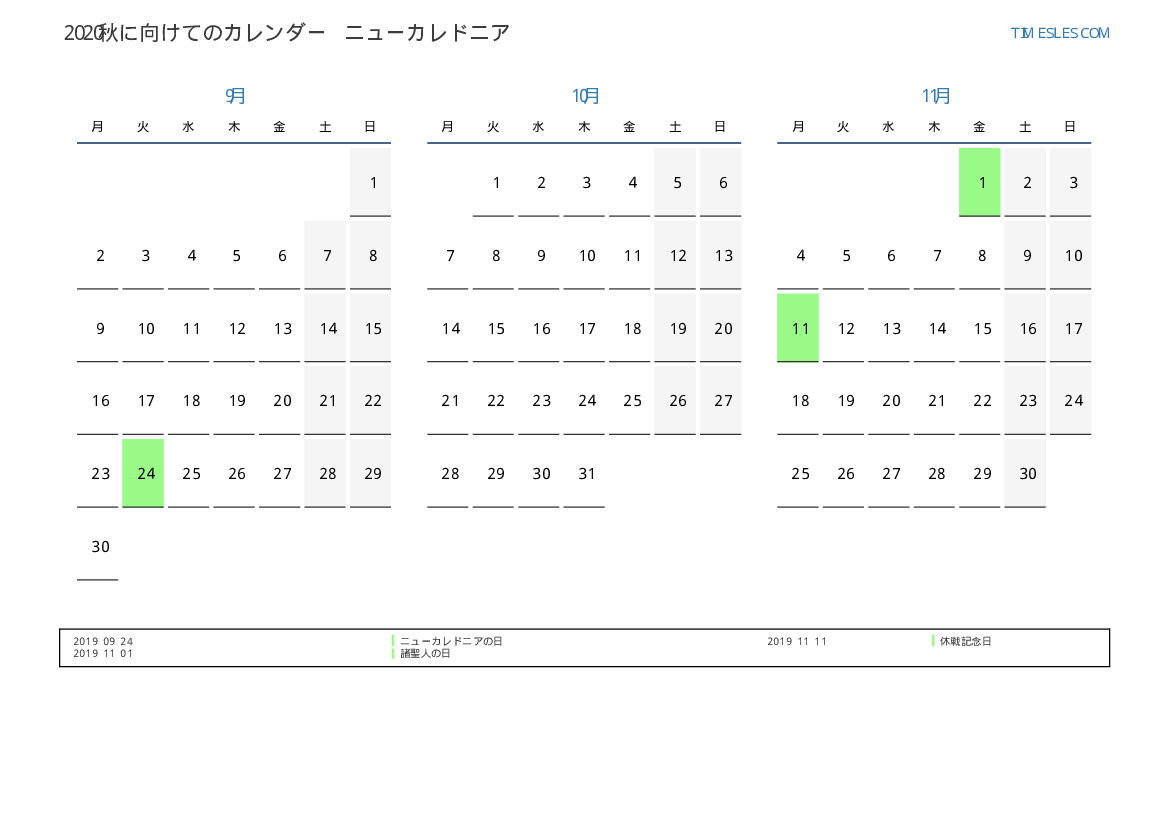 ニューカレドニア向け2019秋に向けての休日と週末のカレンダー