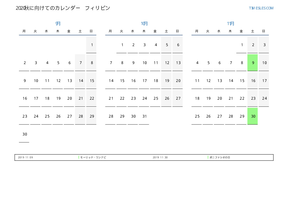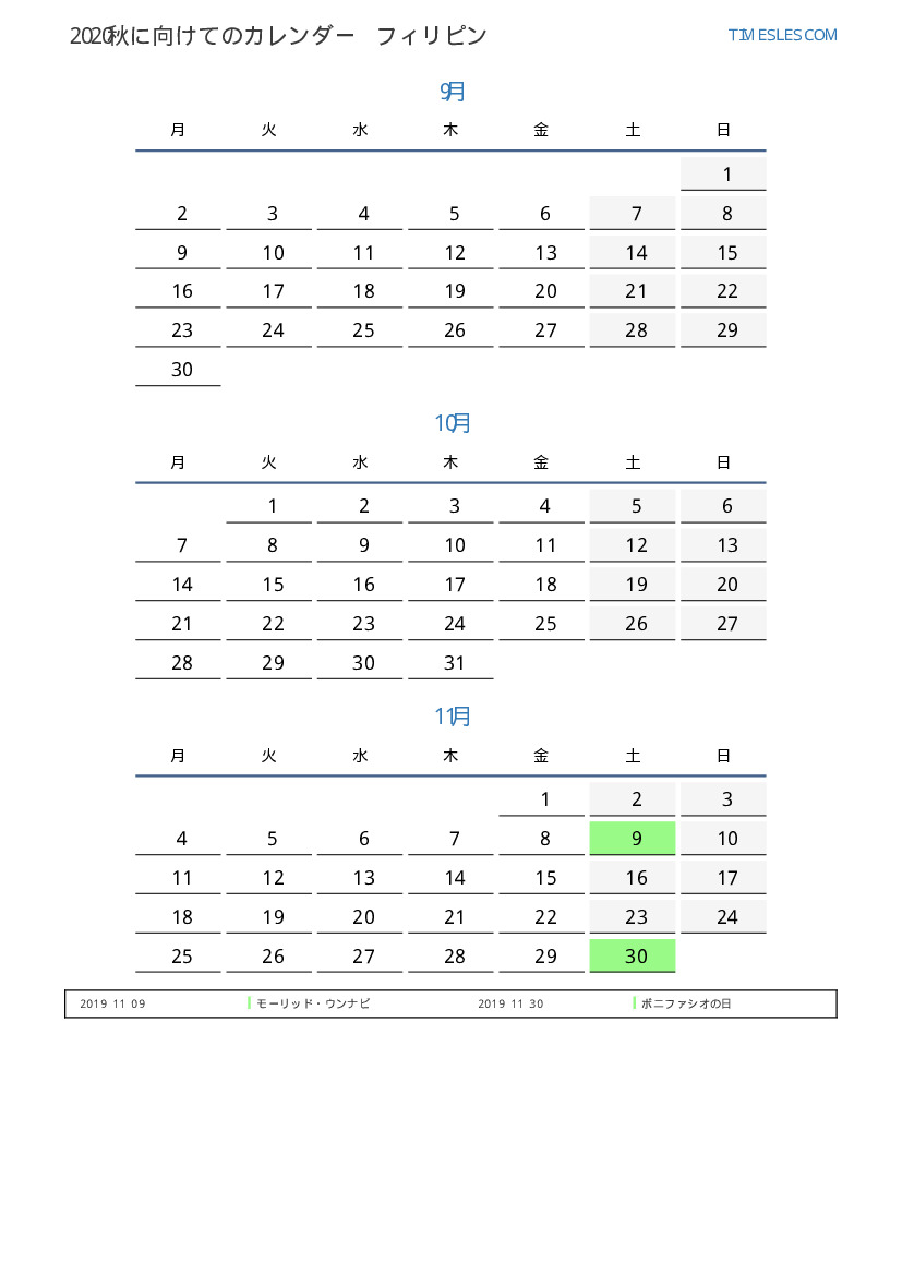 フィリピン向け2019秋に向けての休日と週末のカレンダー
