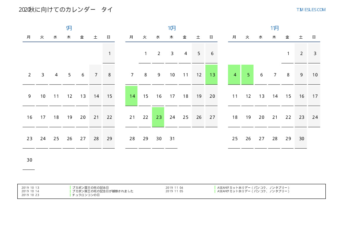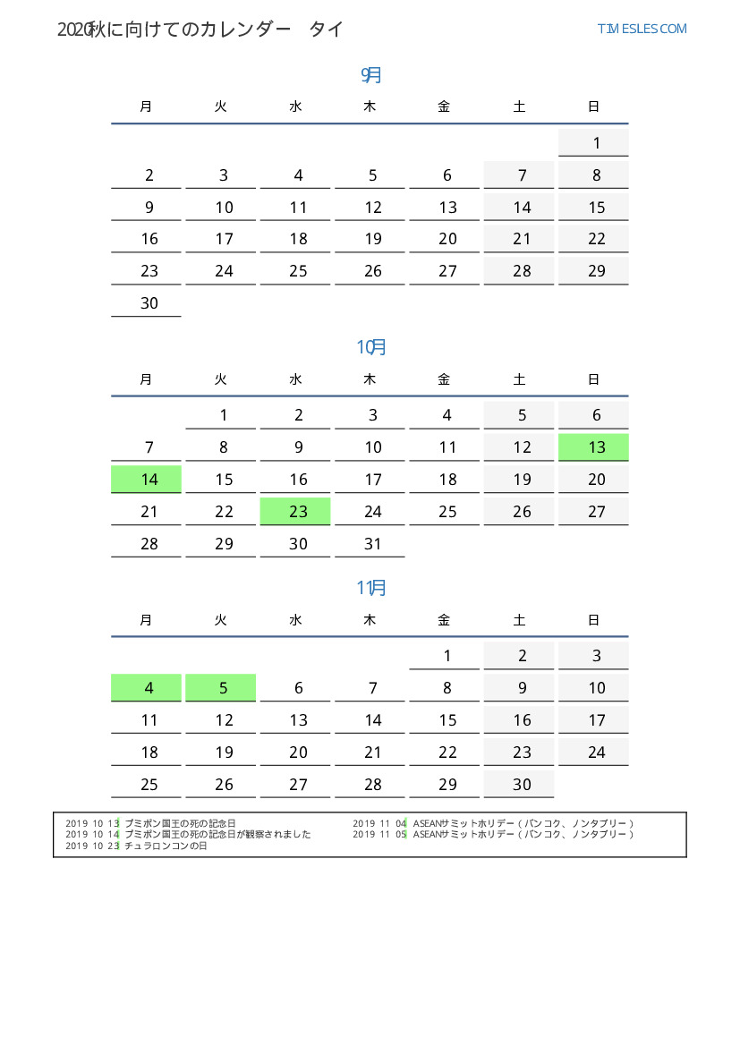 タイ向け2019秋に向けての休日と週末のカレンダー