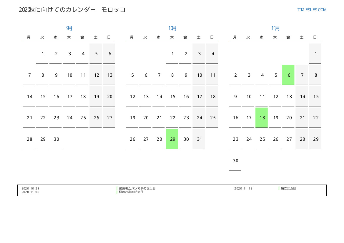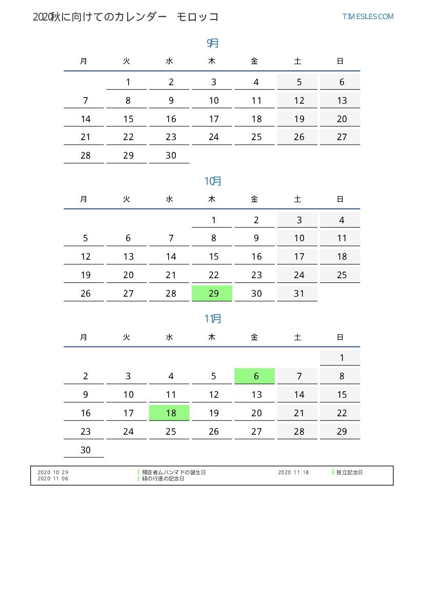 モロッコ向け2020秋に向けての休日と週末のカレンダー
