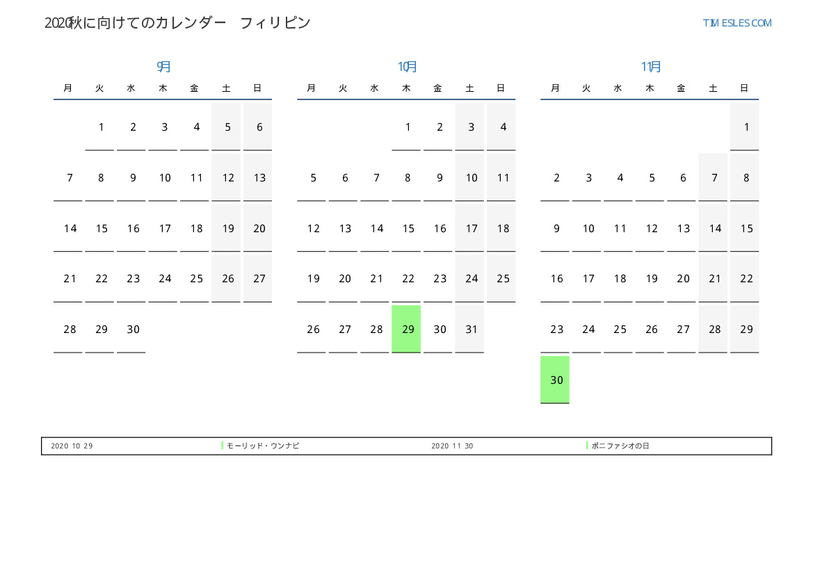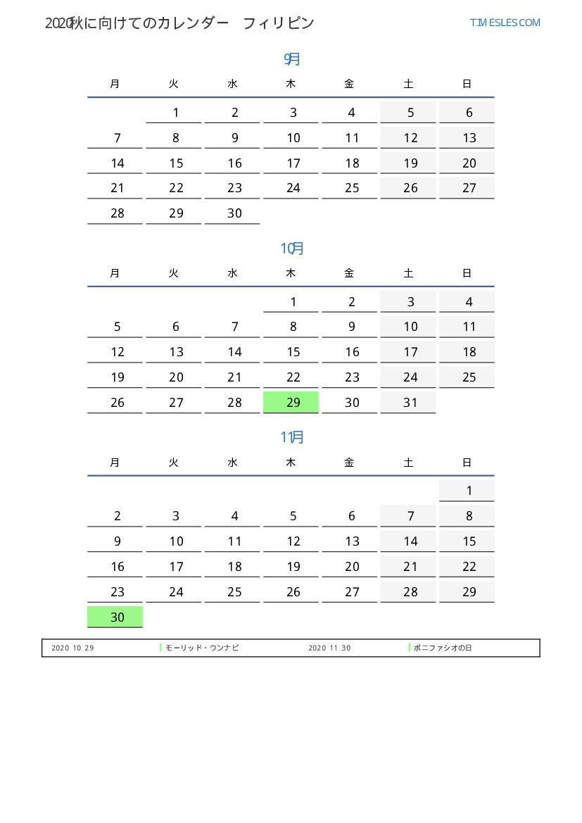 フィリピン向け2020秋に向けての休日と週末のカレンダー