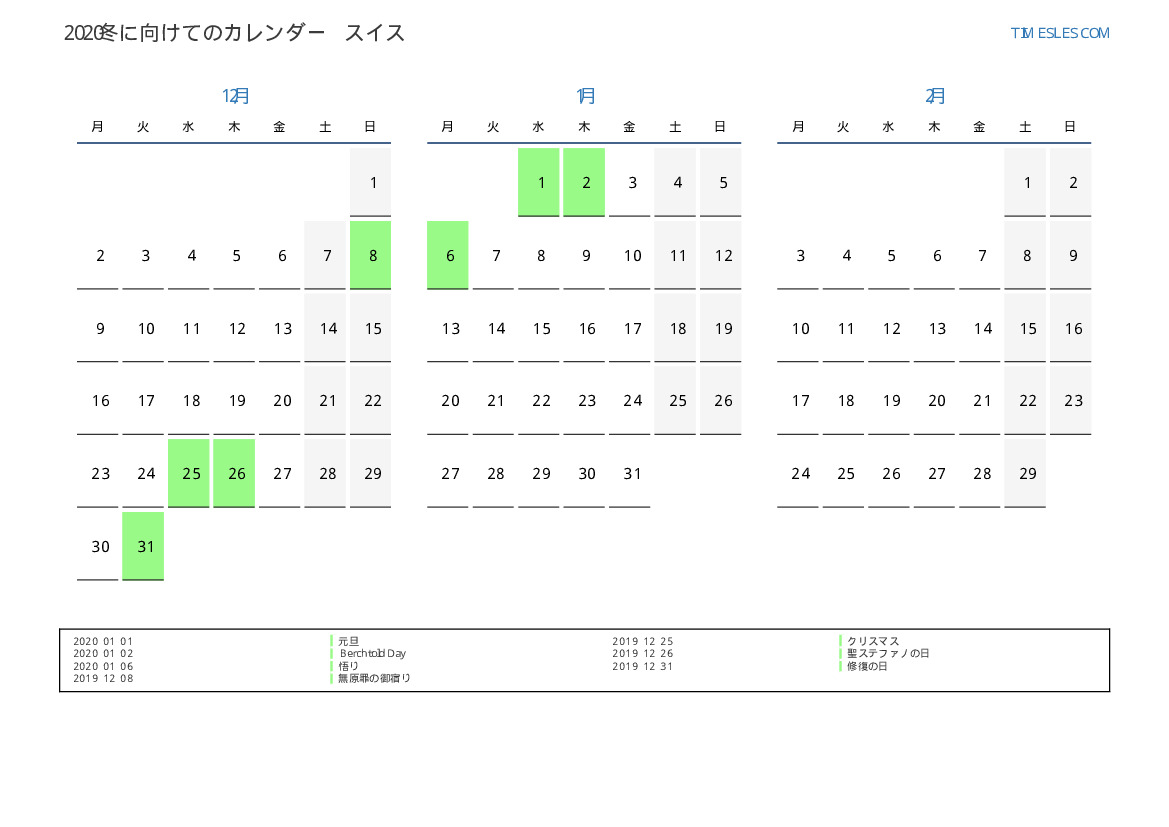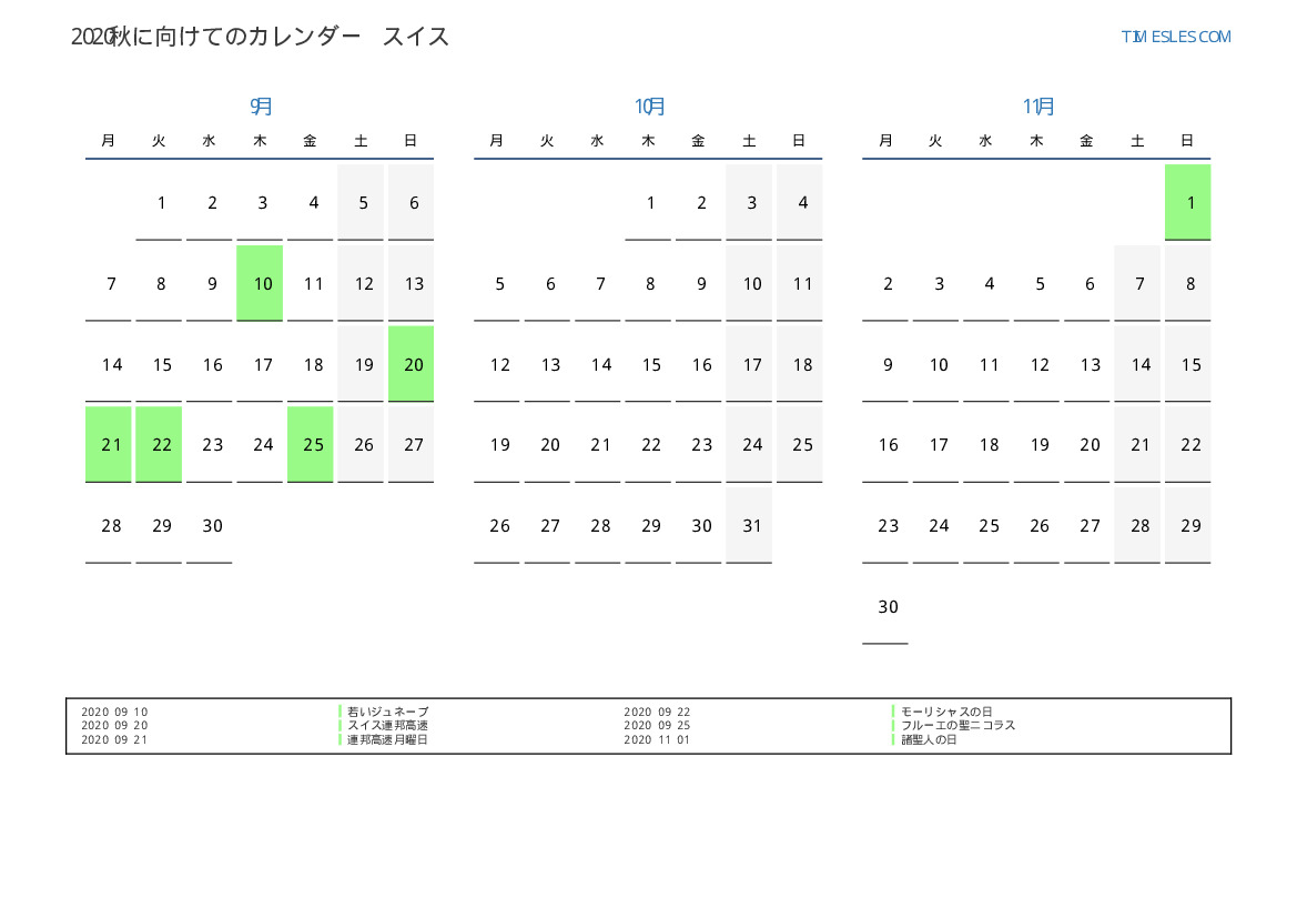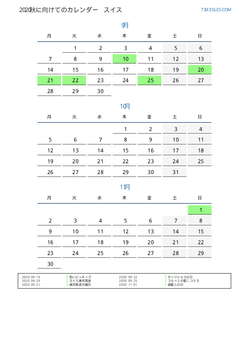スイス向け2020秋に向けての休日と週末のカレンダー