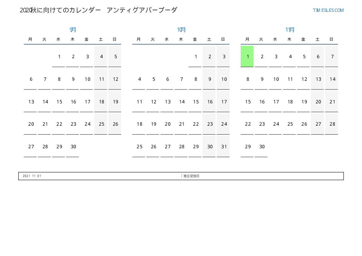 アンティグアバーブーダ2021秋に向けての休日と週末のPDFカレンダーをダウンロードして印刷します