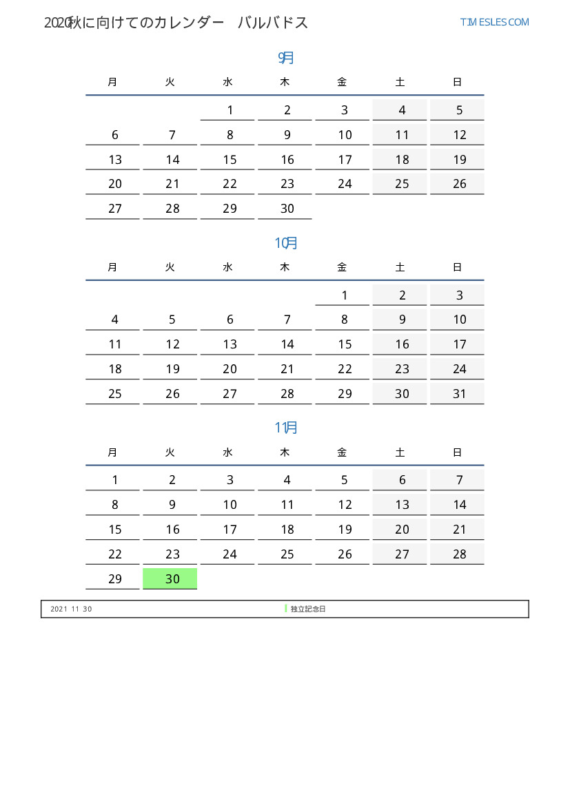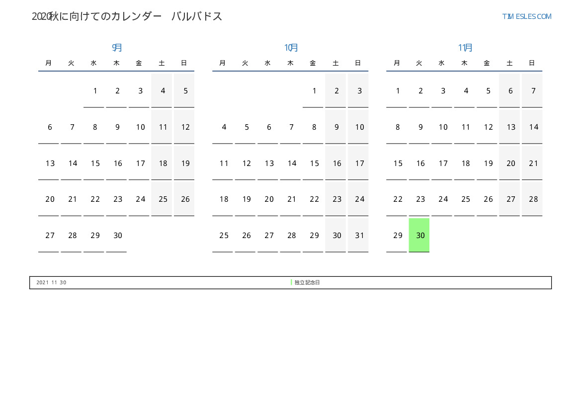 バルバドスのために2021秋に向けての休日と週末のPDFカレンダーをダウンロードして印刷します