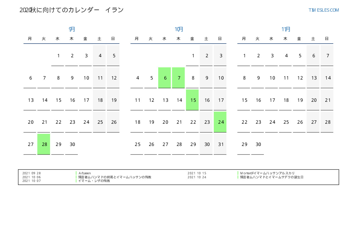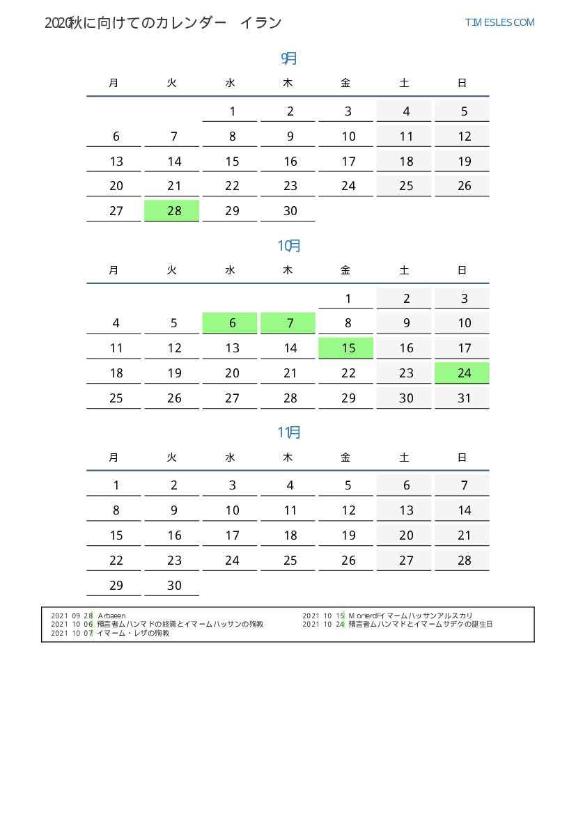 イランのために2021秋に向けての休日と週末のPDFカレンダーをダウンロードして印刷します