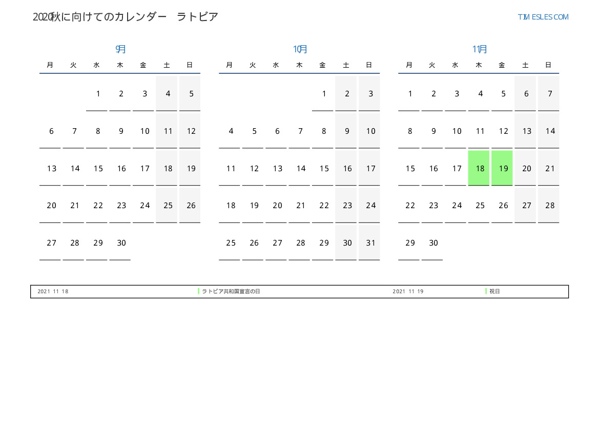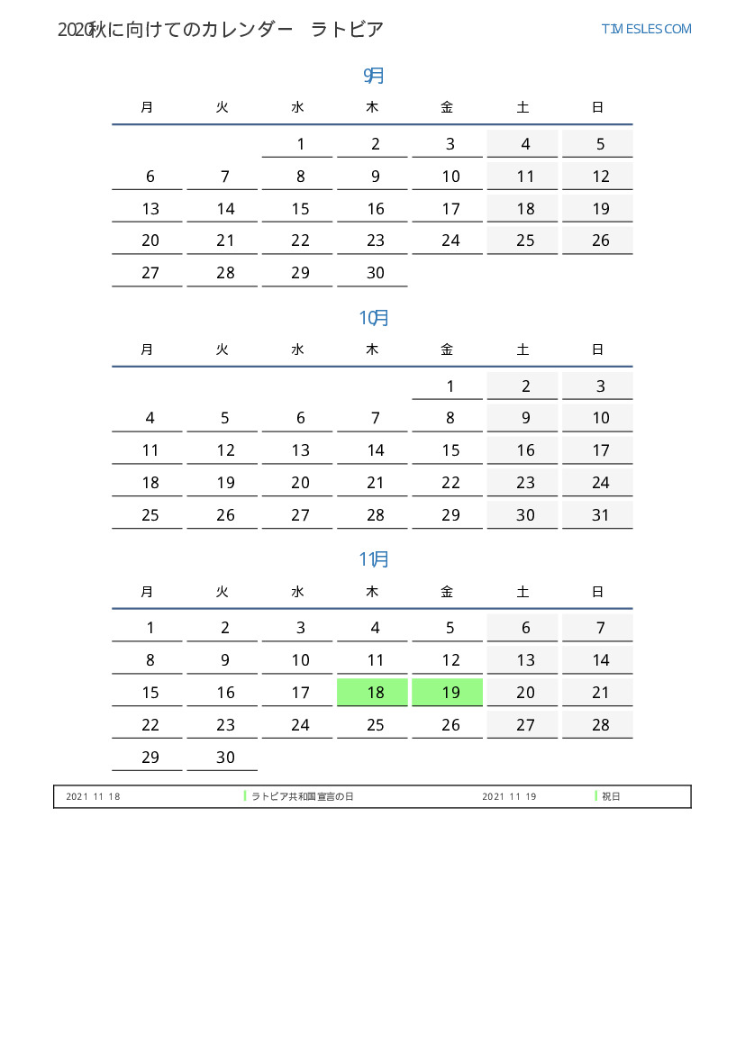 ラトビア向け2021秋に向けての休日と週末のカレンダー