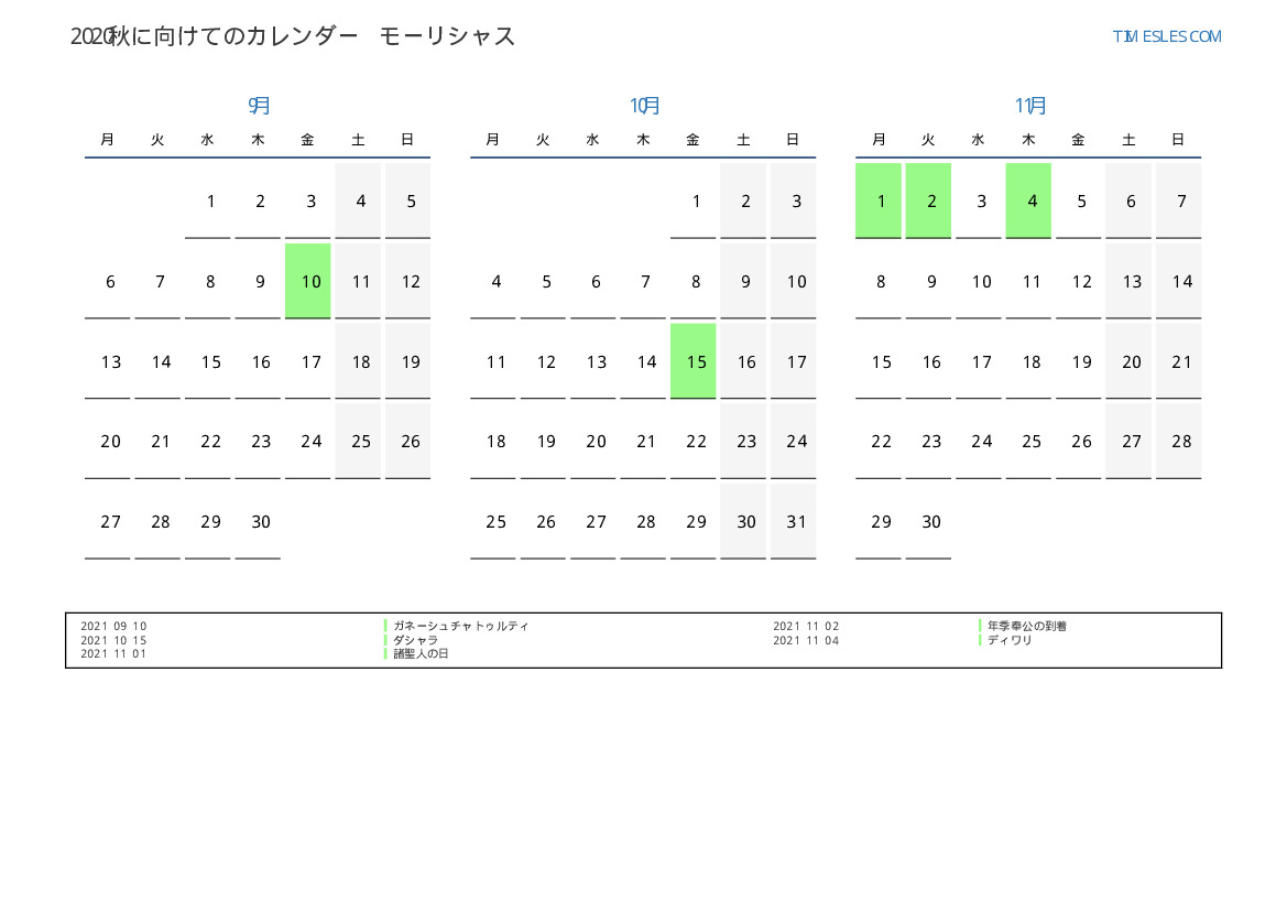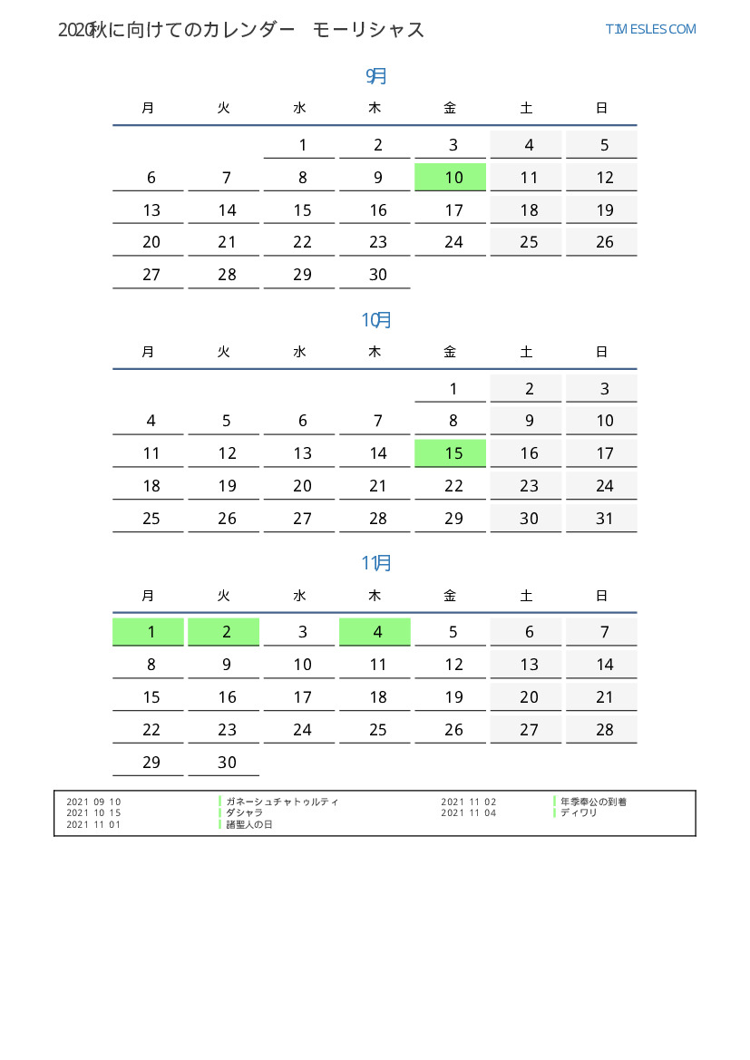 モーリシャスのために2021秋に向けての休日と週末のPDFカレンダーをダウンロードして印刷します