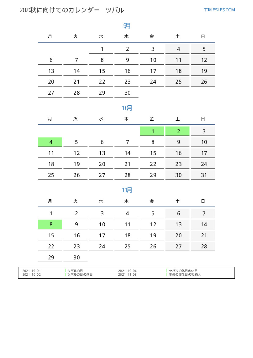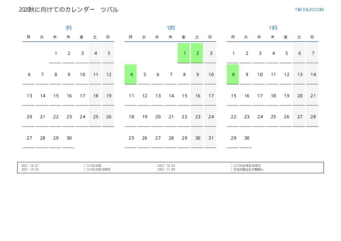 ツバル向け2021秋に向けての休日と週末のカレンダー