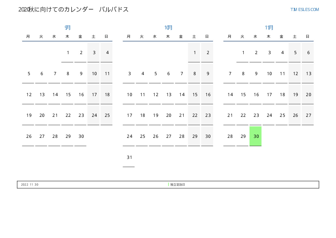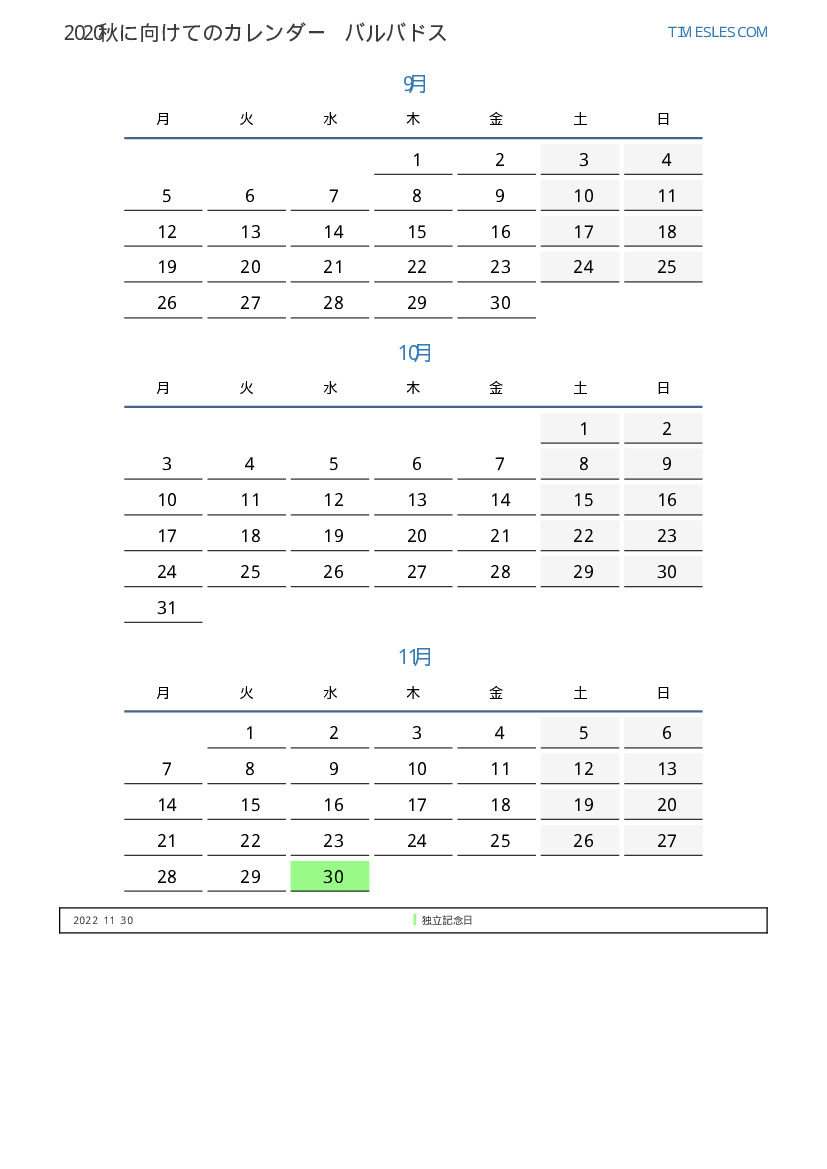 バルバドスのために2022秋に向けての休日と週末のPDFカレンダーをダウンロードして印刷します