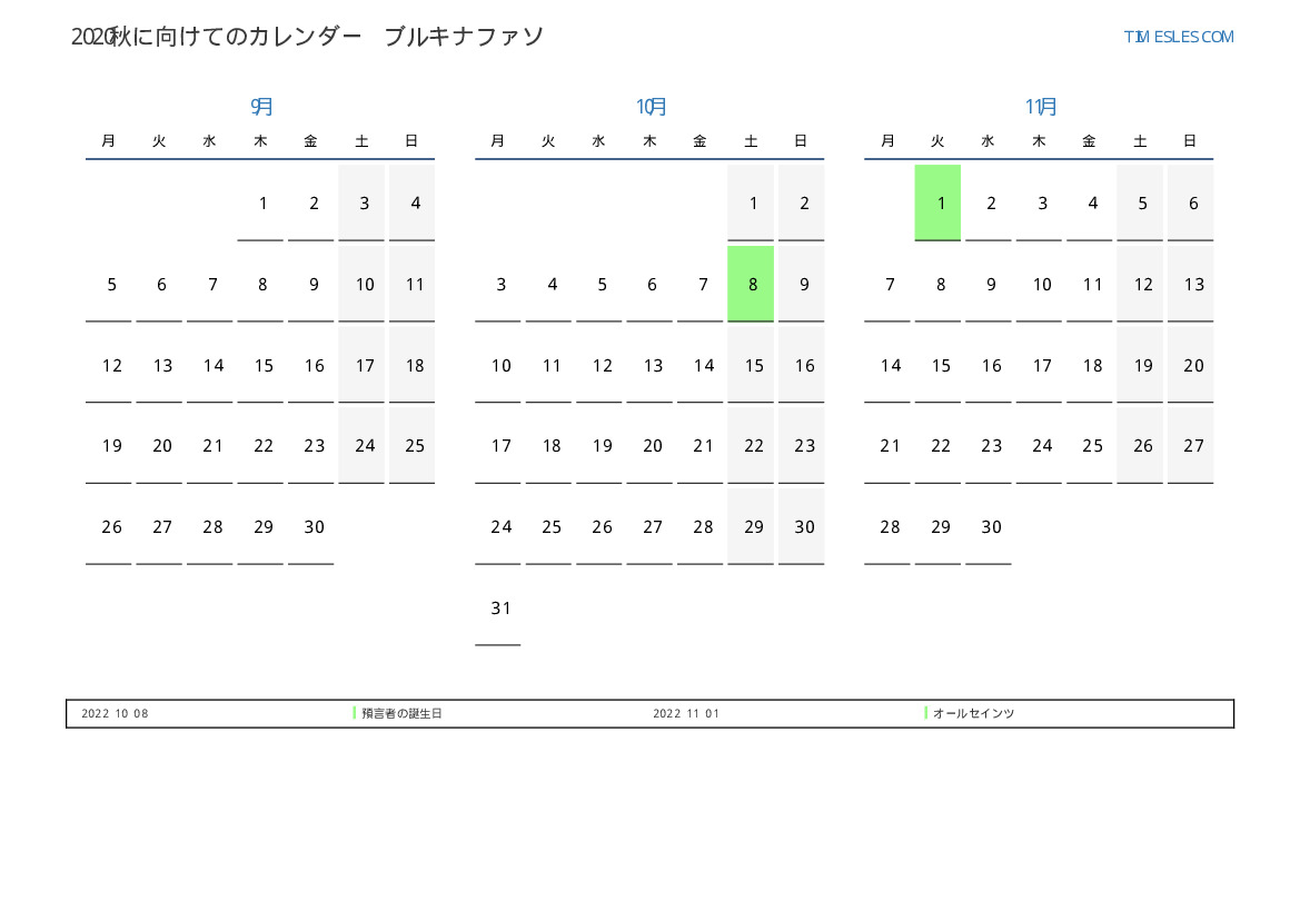 ブルキナファソ2022秋に向けての休日と週末のPDFカレンダーをダウンロードして印刷します