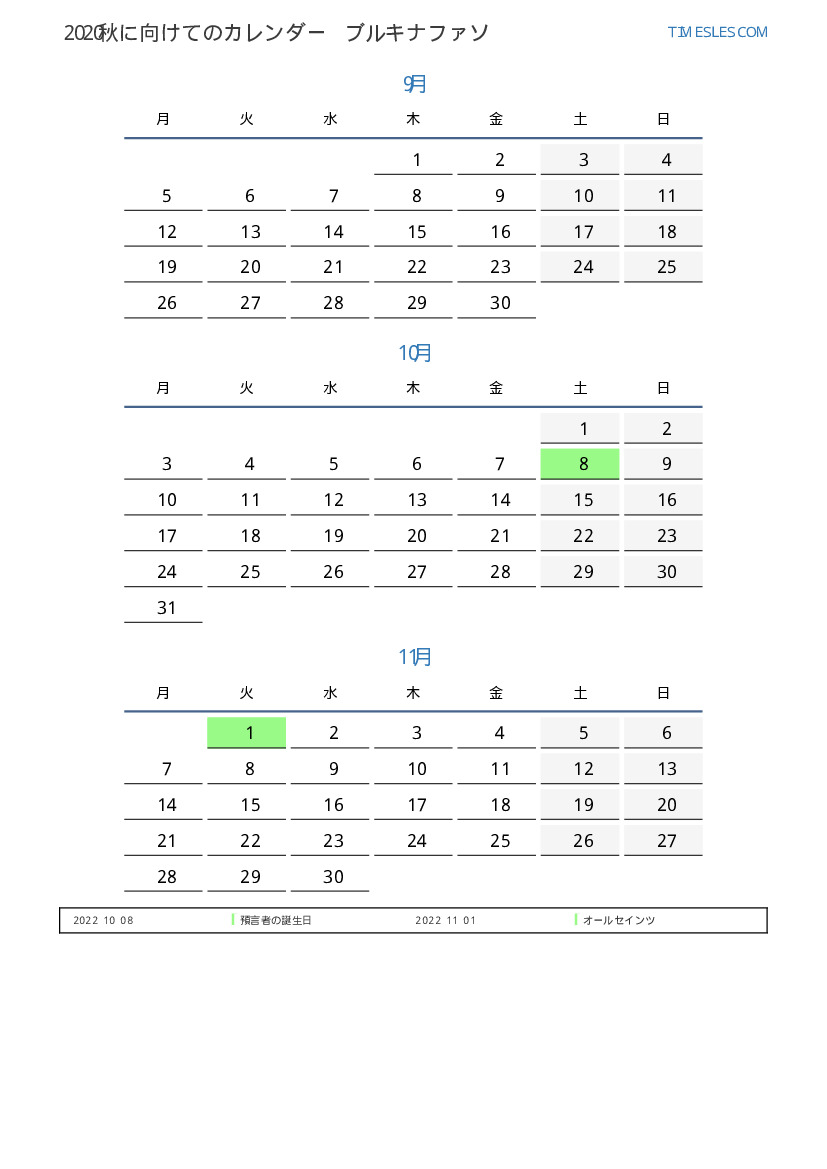 ブルキナファソ2022秋に向けての休日と週末のカレンダー