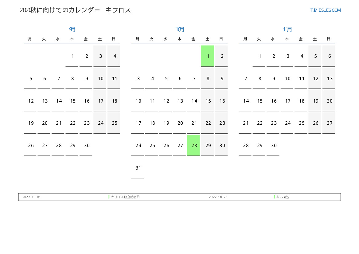 キプロス向け2022秋に向けての休日と週末のカレンダー