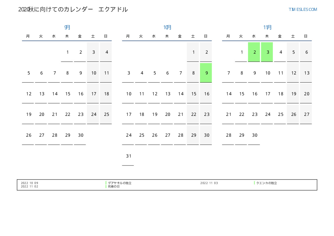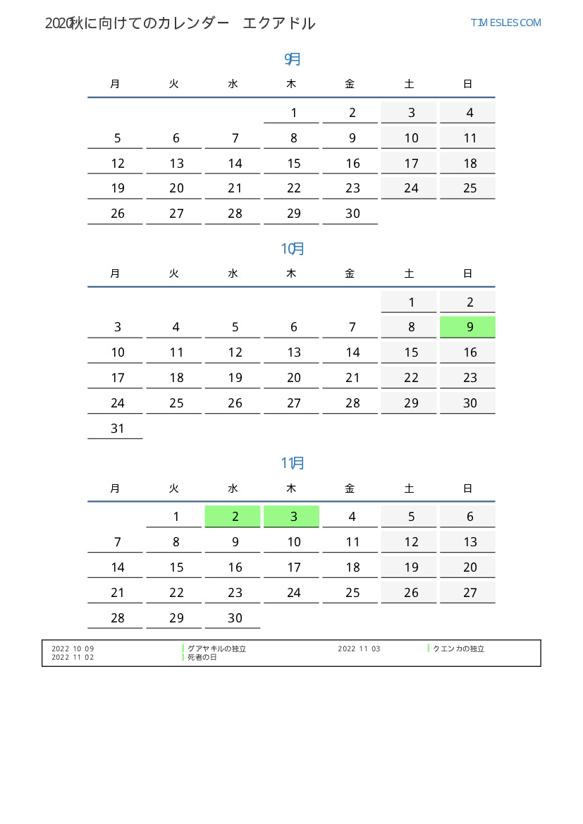 エクアドル向け2022秋に向けての休日と週末のカレンダー