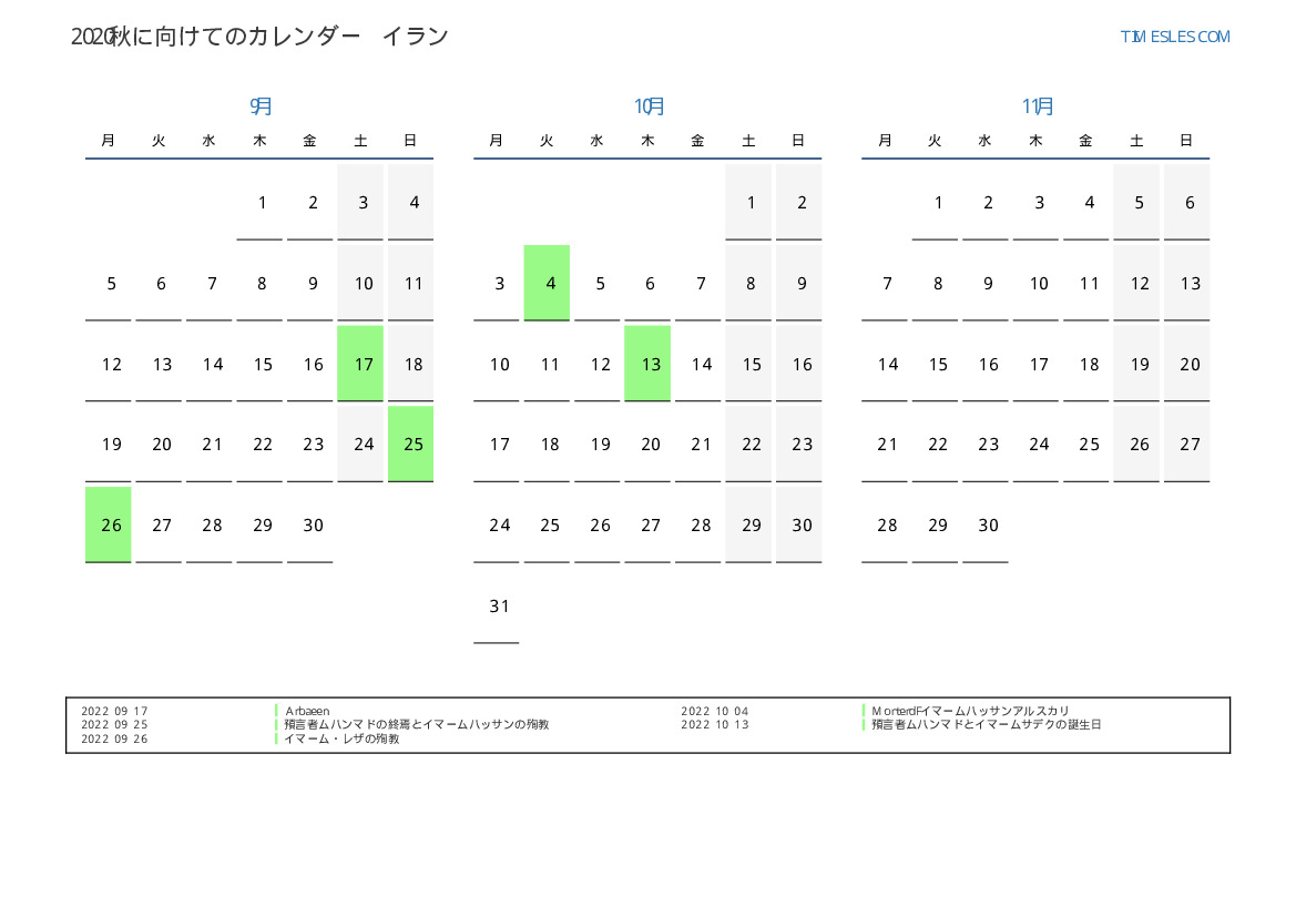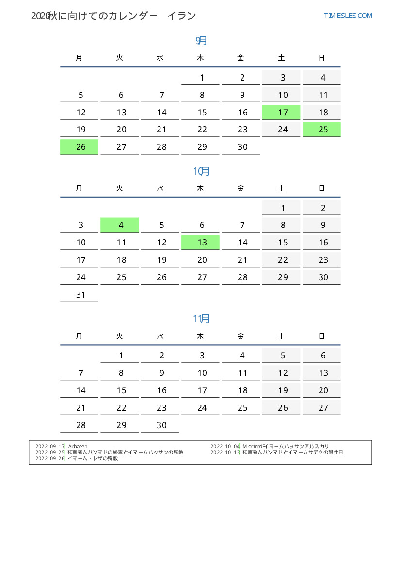 イランのために2022秋に向けての休日と週末のPDFカレンダーをダウンロードして印刷します