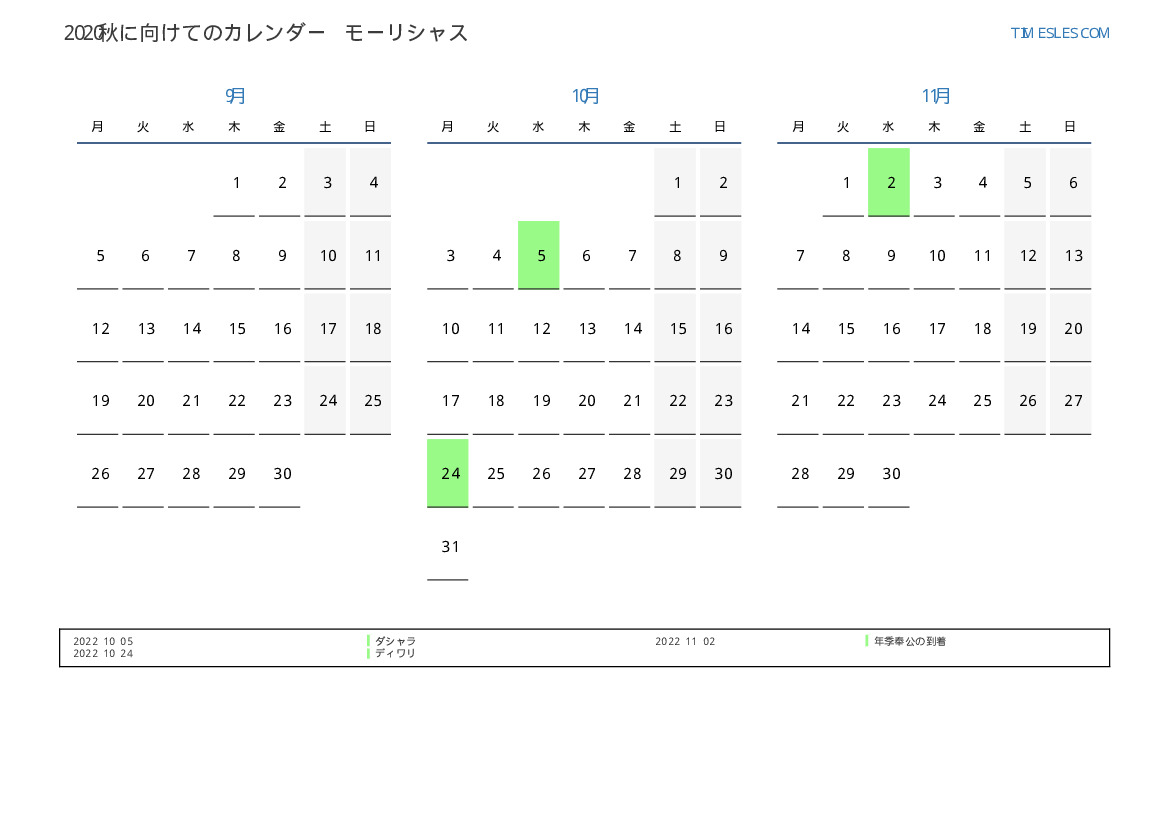 モーリシャスのために2022秋に向けての休日と週末のPDFカレンダーをダウンロードして印刷します