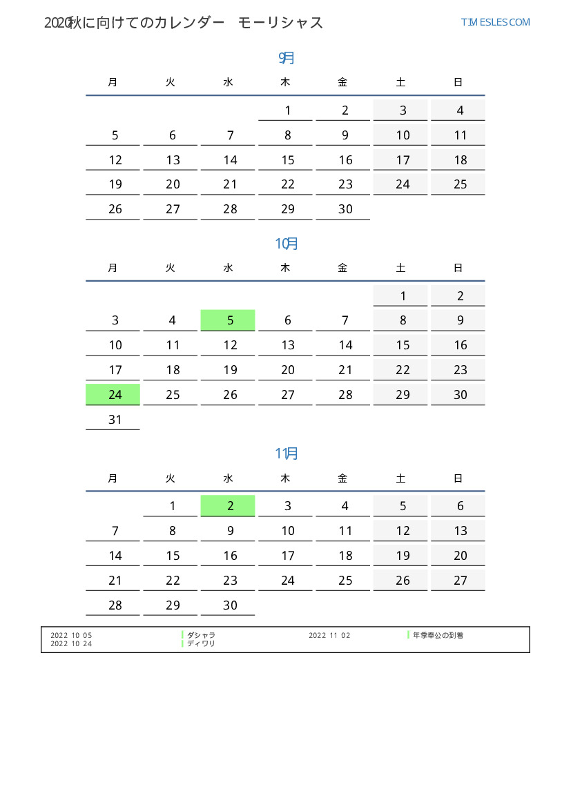 モーリシャスのために2022年秋に向けてのカレンダー