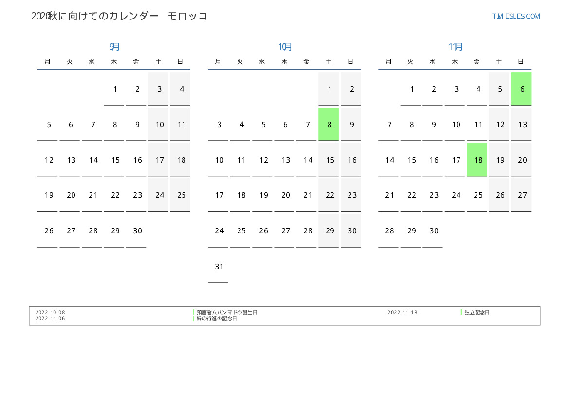モロッコ向け2022秋に向けての休日と週末のカレンダー