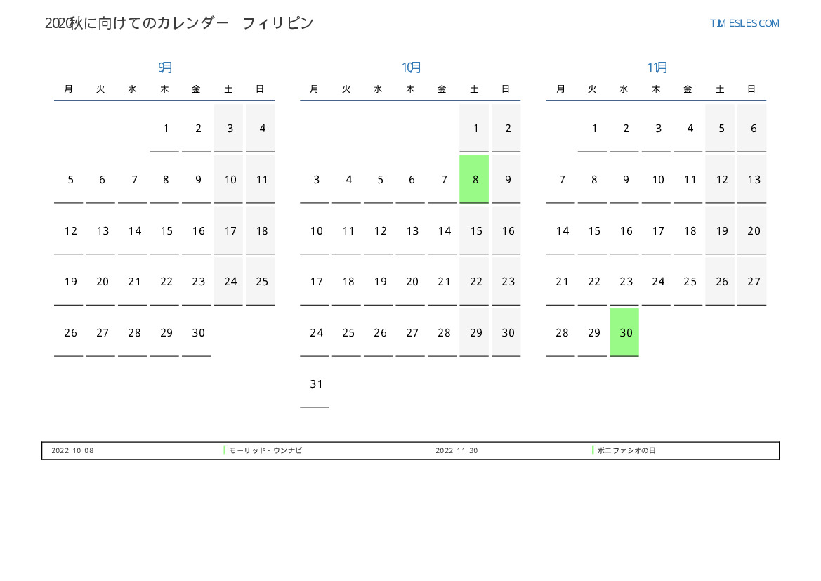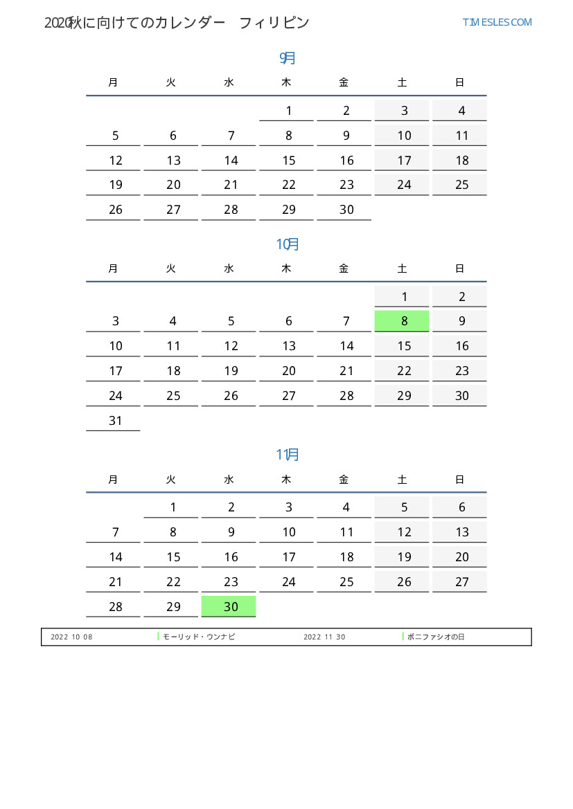 フィリピン向け2022秋に向けての休日と週末のカレンダー