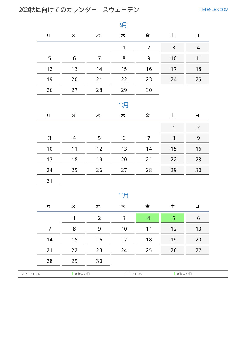 スウェーデン向け2022秋に向けての休日と週末のカレンダー