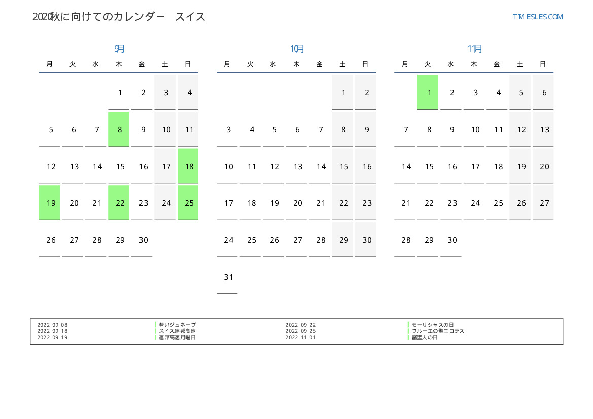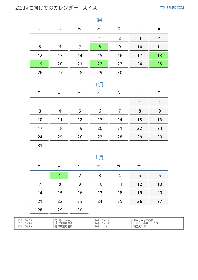 スイス向け2022秋に向けての休日と週末のカレンダー