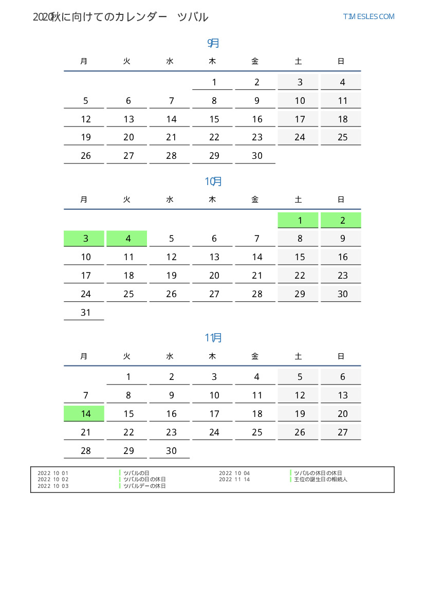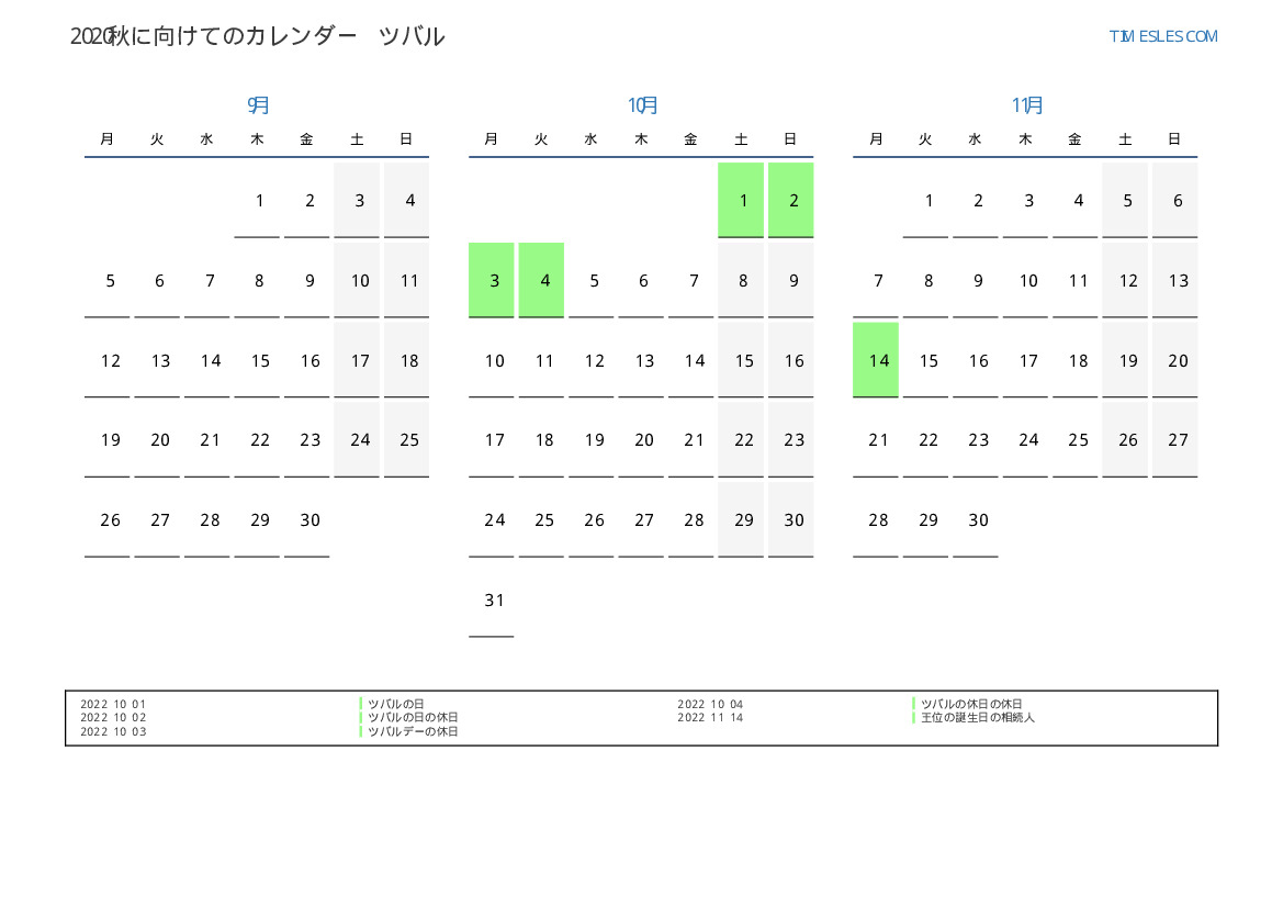 ツバル向け2022秋に向けての休日と週末のカレンダー