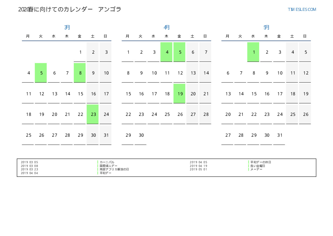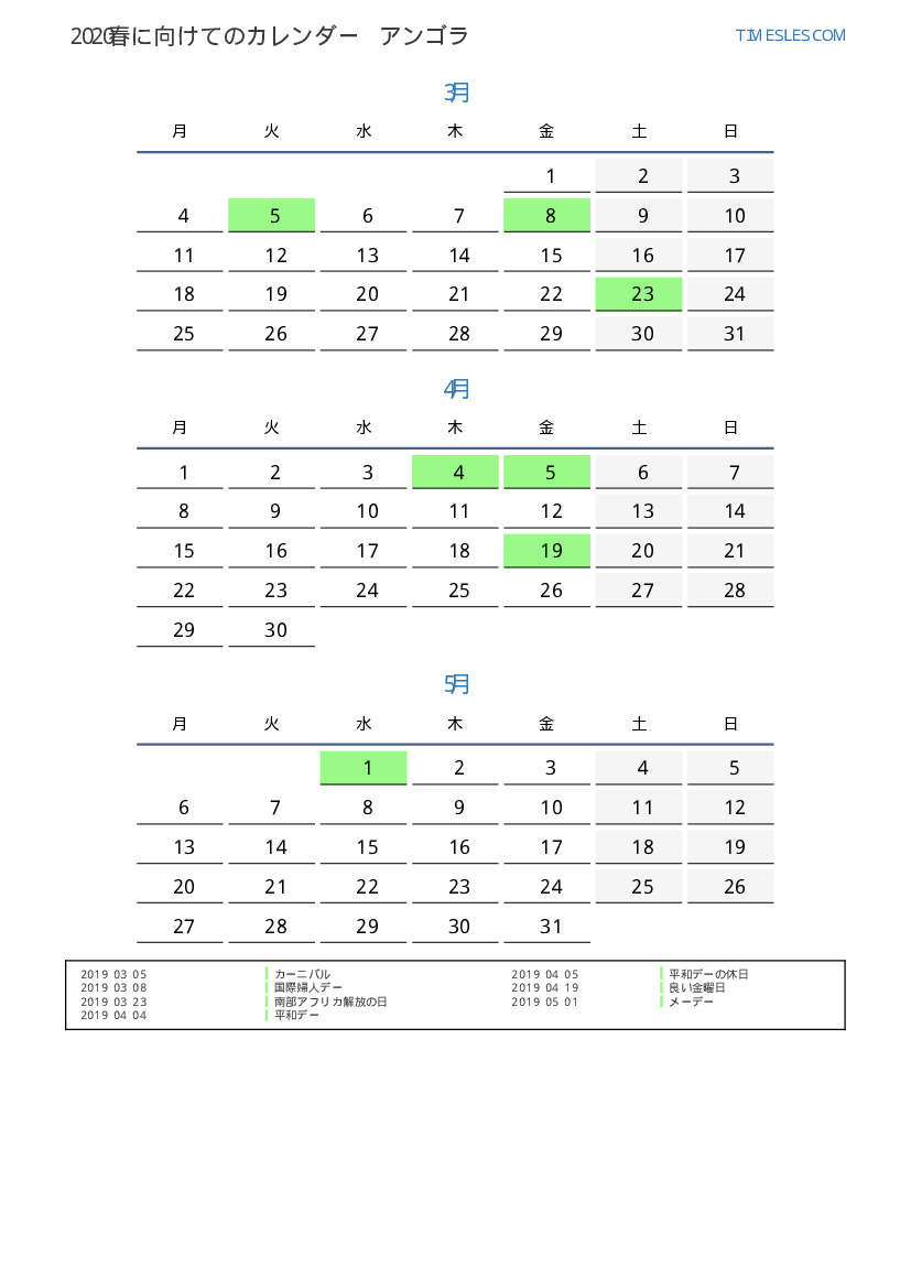 アンゴラ向け2019春に向けての休日と週末のカレンダー