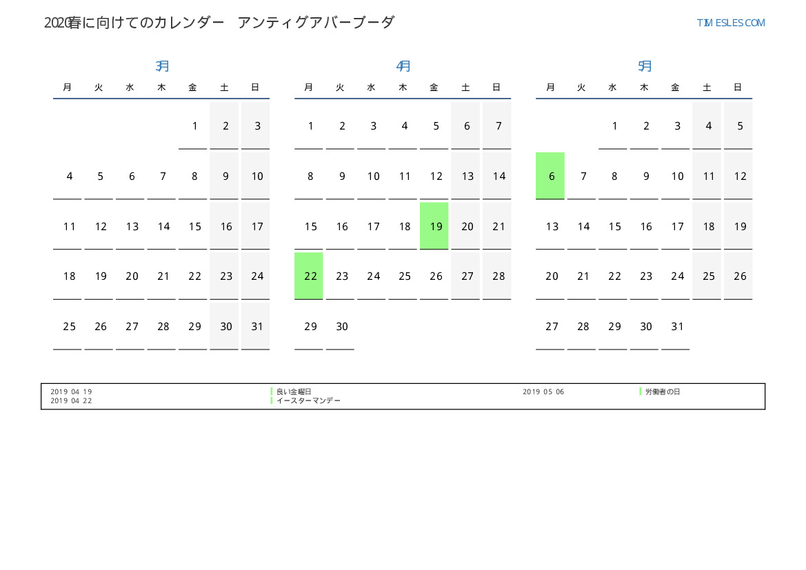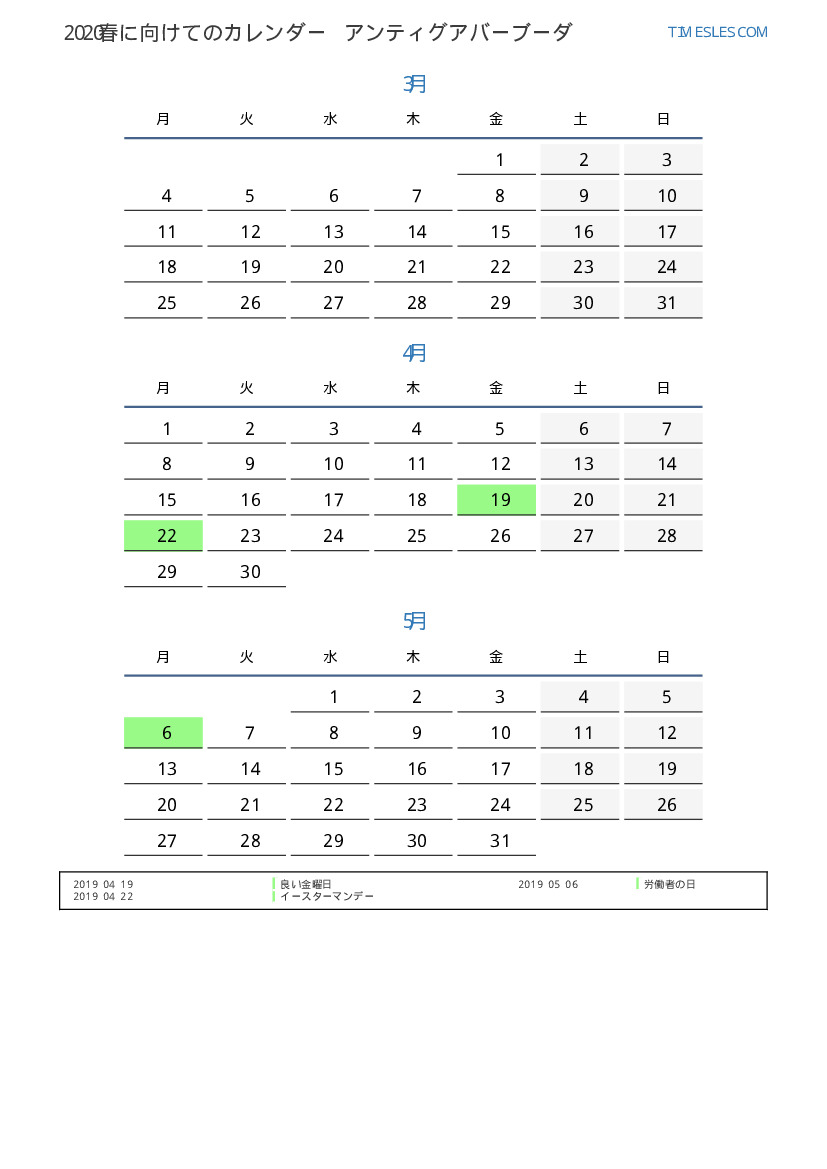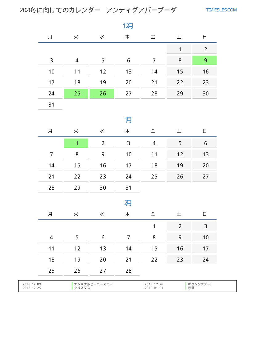 アンティグアバーブーダ2019年春に向けてのカレンダー