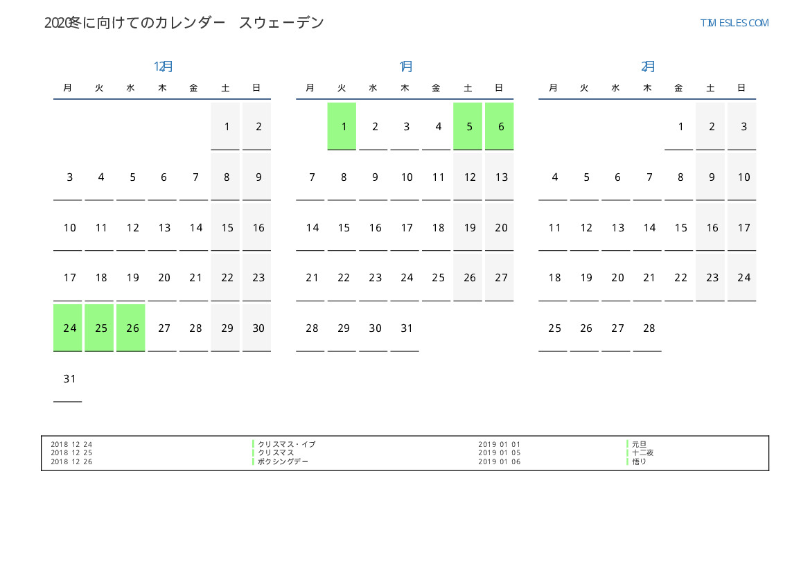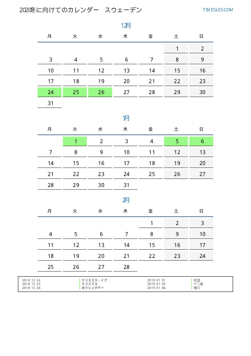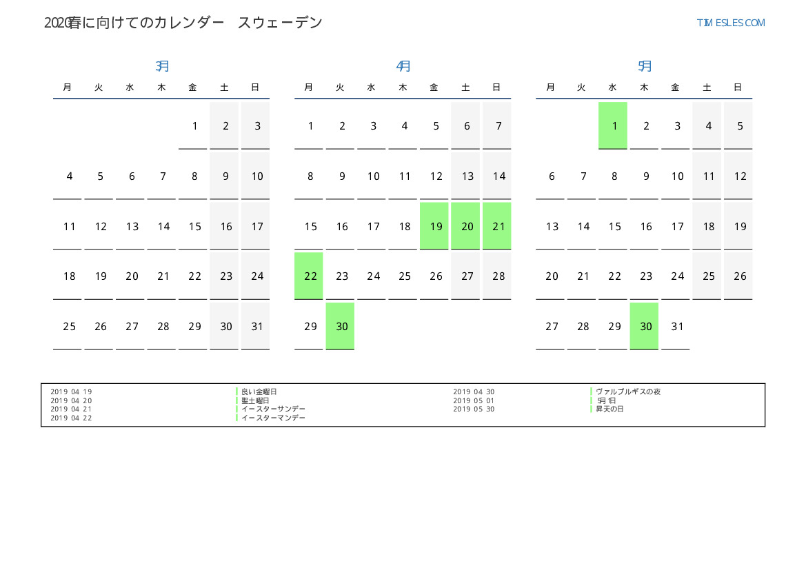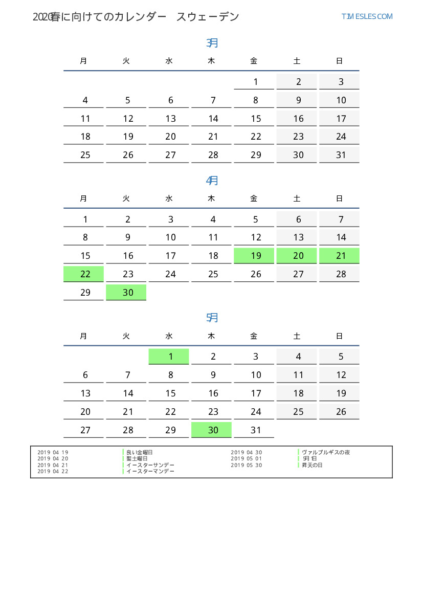 スウェーデン向け2019春に向けての休日と週末のカレンダー