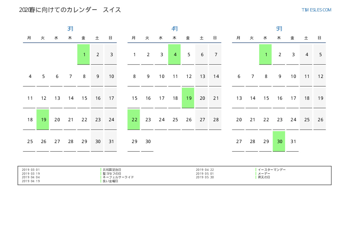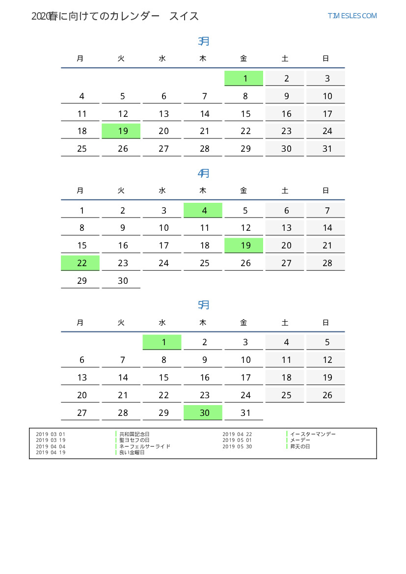 スイス向け2019春に向けての休日と週末のカレンダー
