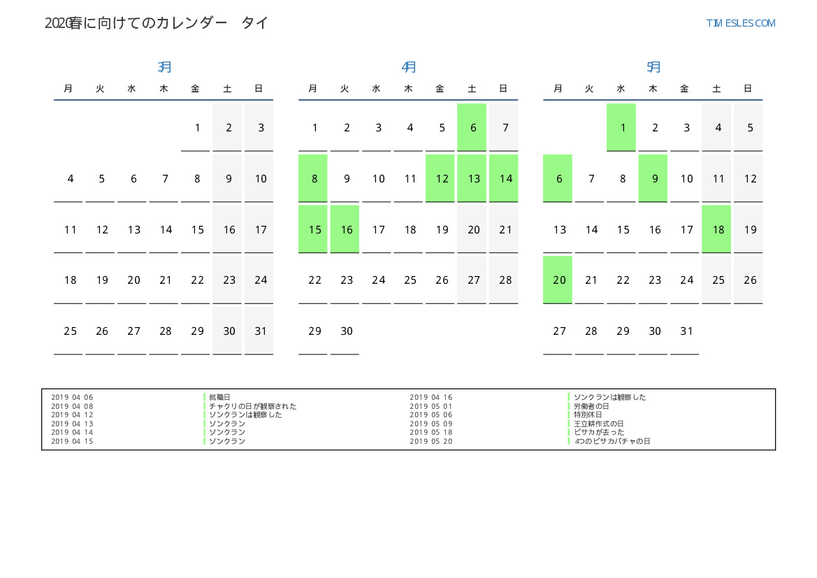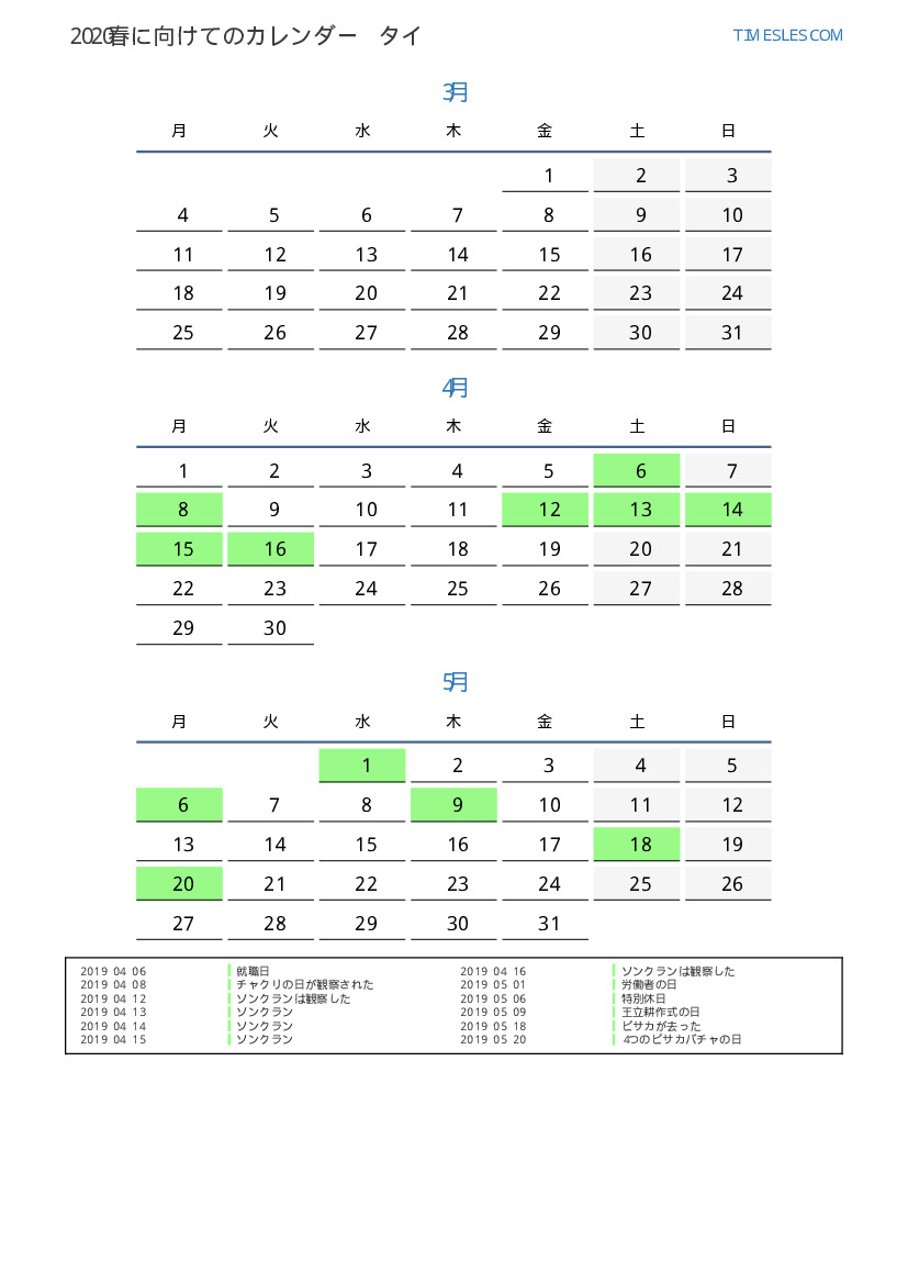 タイ向け2019春に向けての休日と週末のPDFカレンダーをダウンロードして印刷します