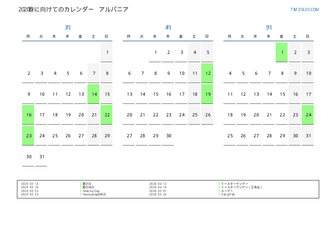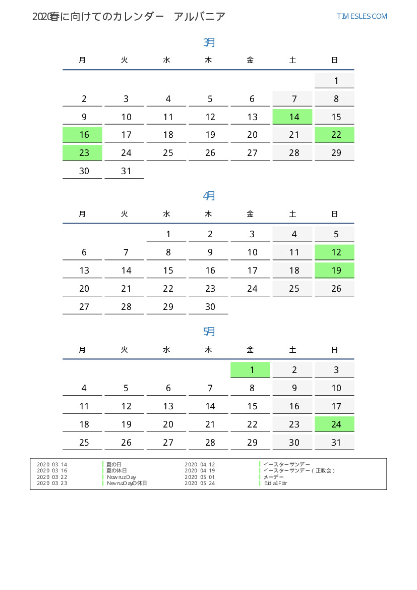 アルバニアの場合2020春に向けての休日と週末のカレンダー