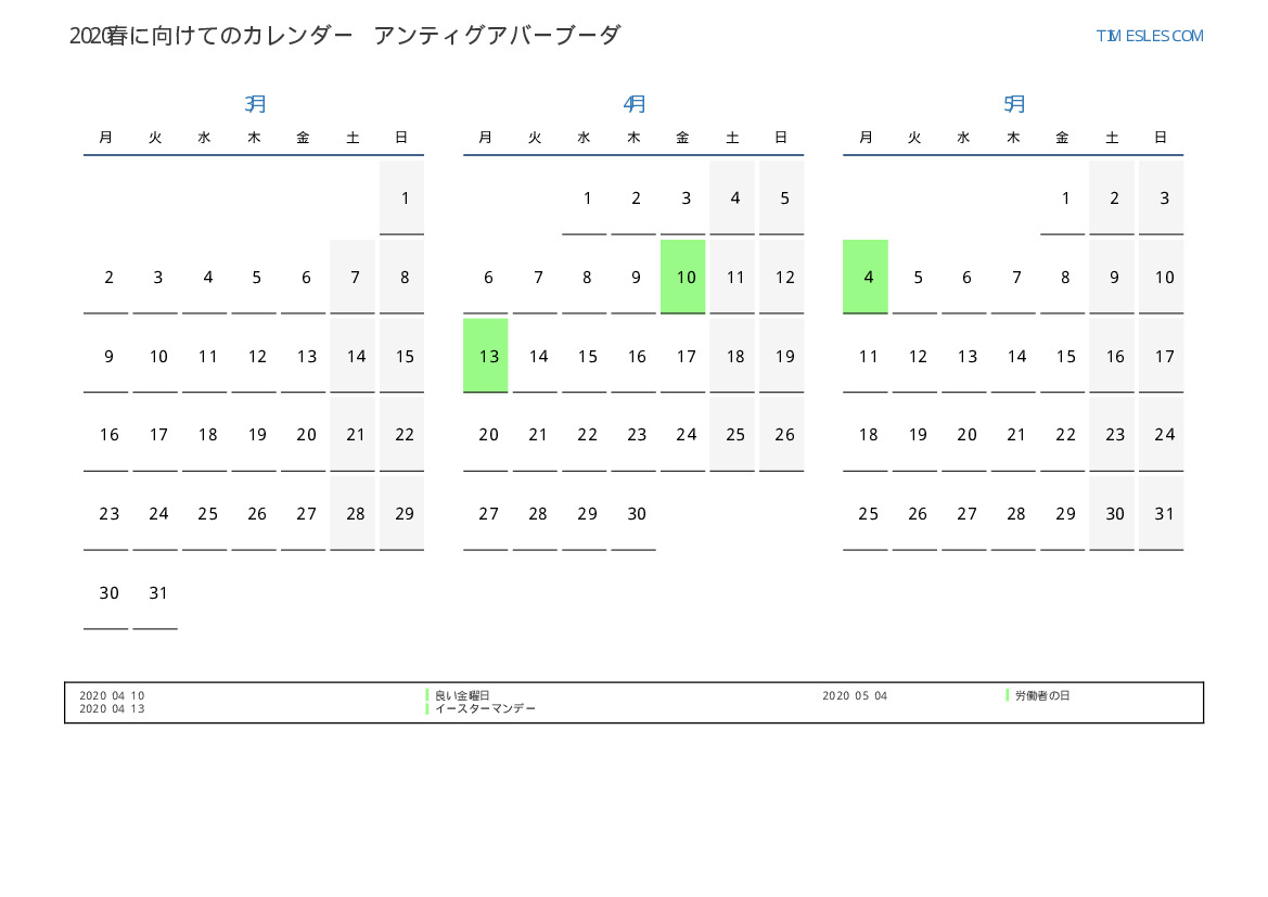 アンティグアバーブーダ2020年春に向けてのカレンダー