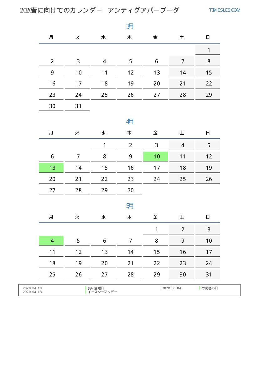 アンティグアバーブーダ2020春に向けての休日と週末のPDFカレンダーをダウンロードして印刷します