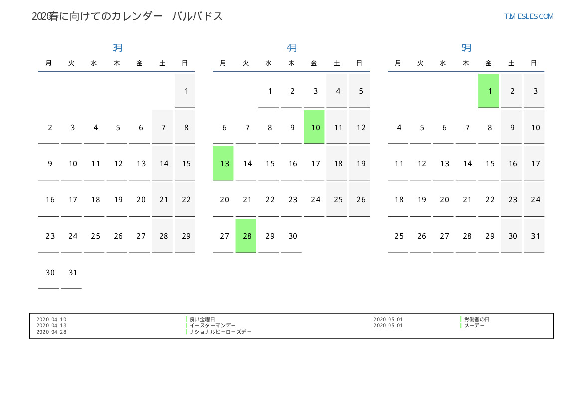 バルバドスのために2020春に向けての休日と週末のPDFカレンダーをダウンロードして印刷します