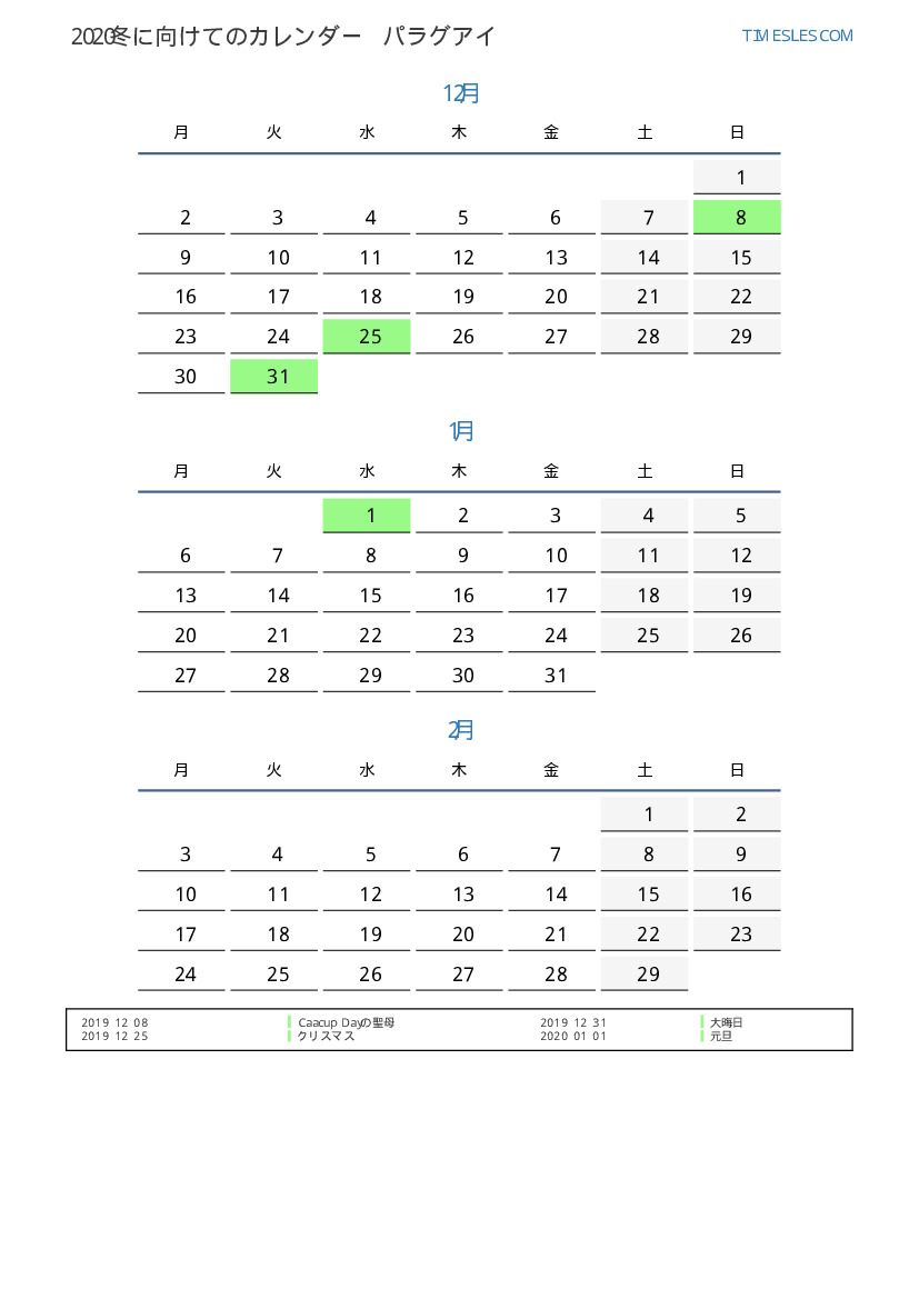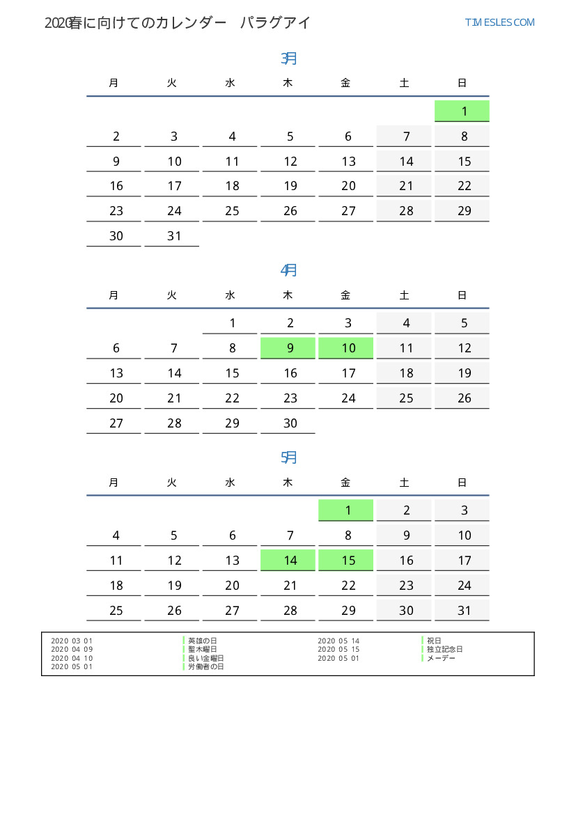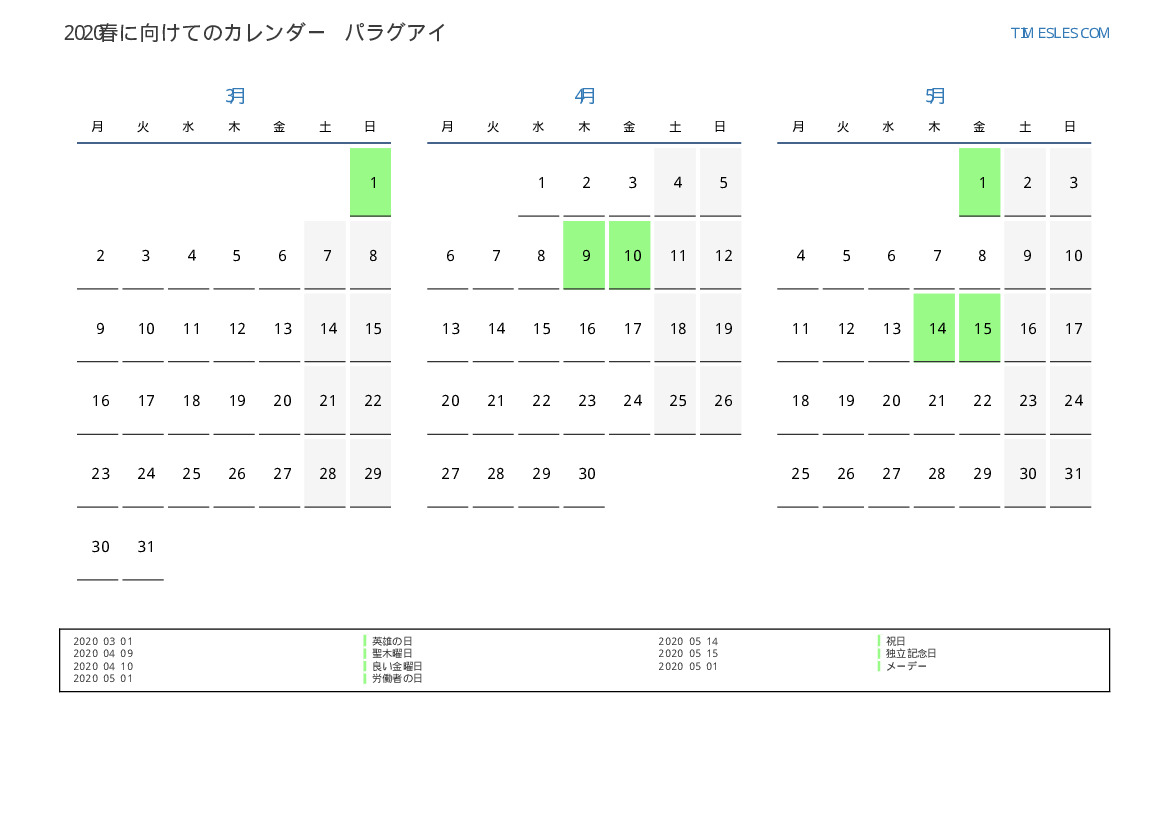 パラグアイ向け2020春に向けての休日と週末のカレンダー