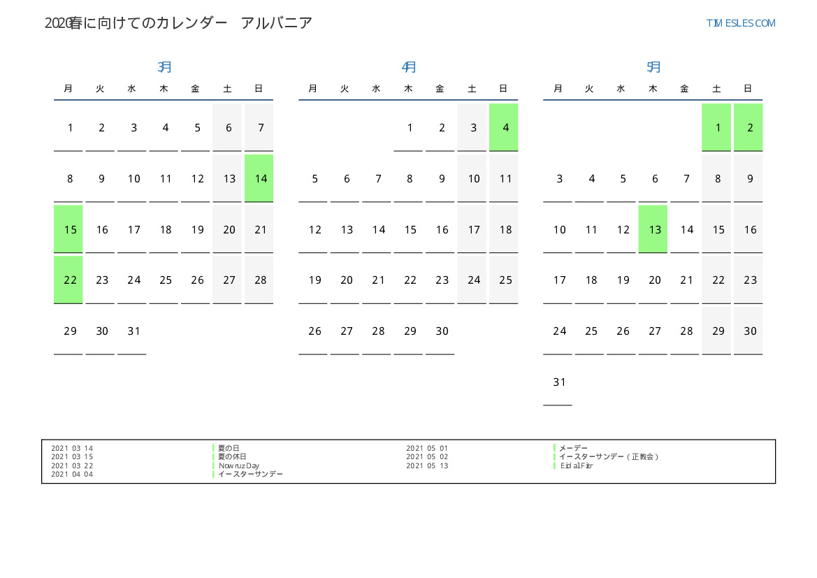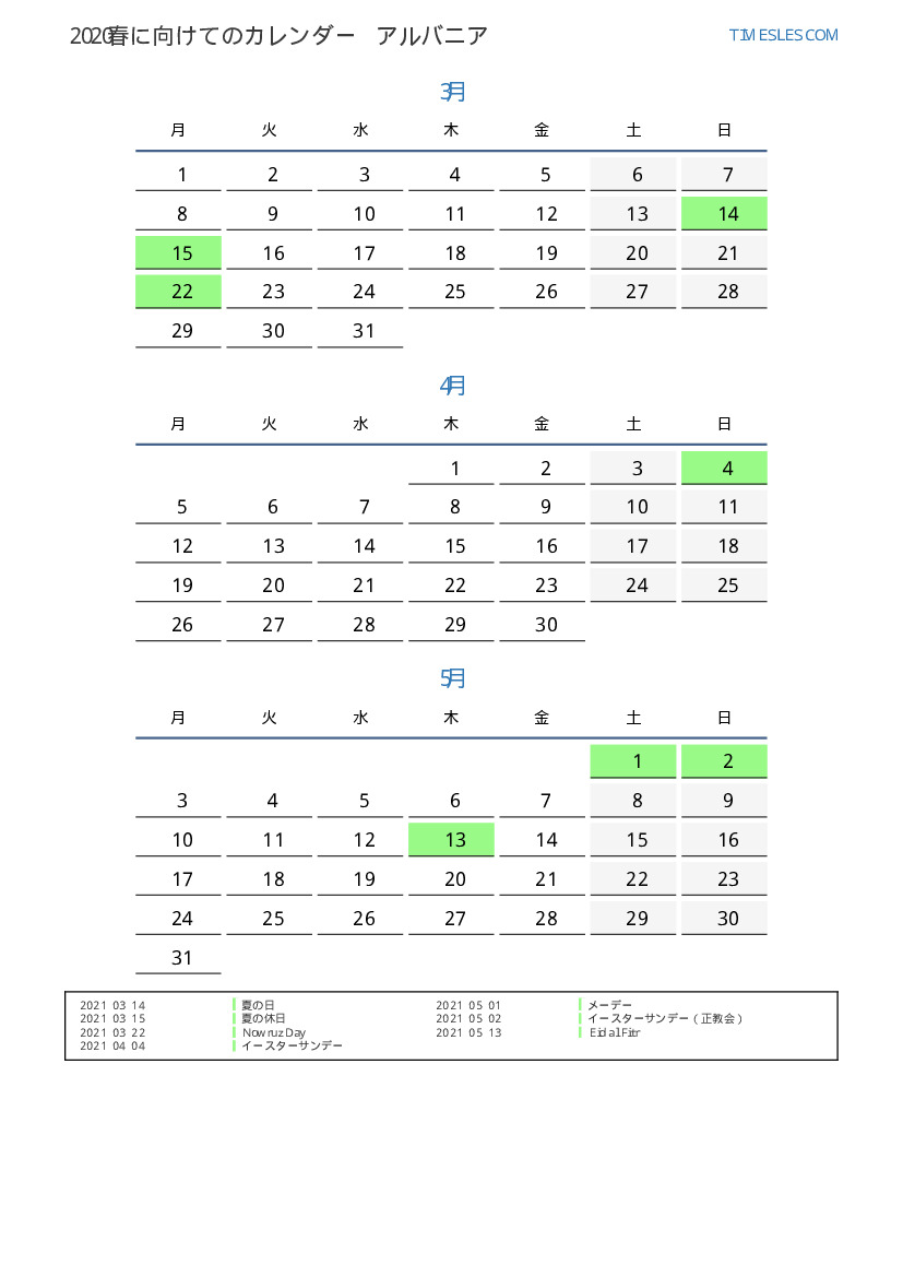 アルバニアの場合2021春に向けての休日と週末のPDFカレンダーをダウンロードして印刷します