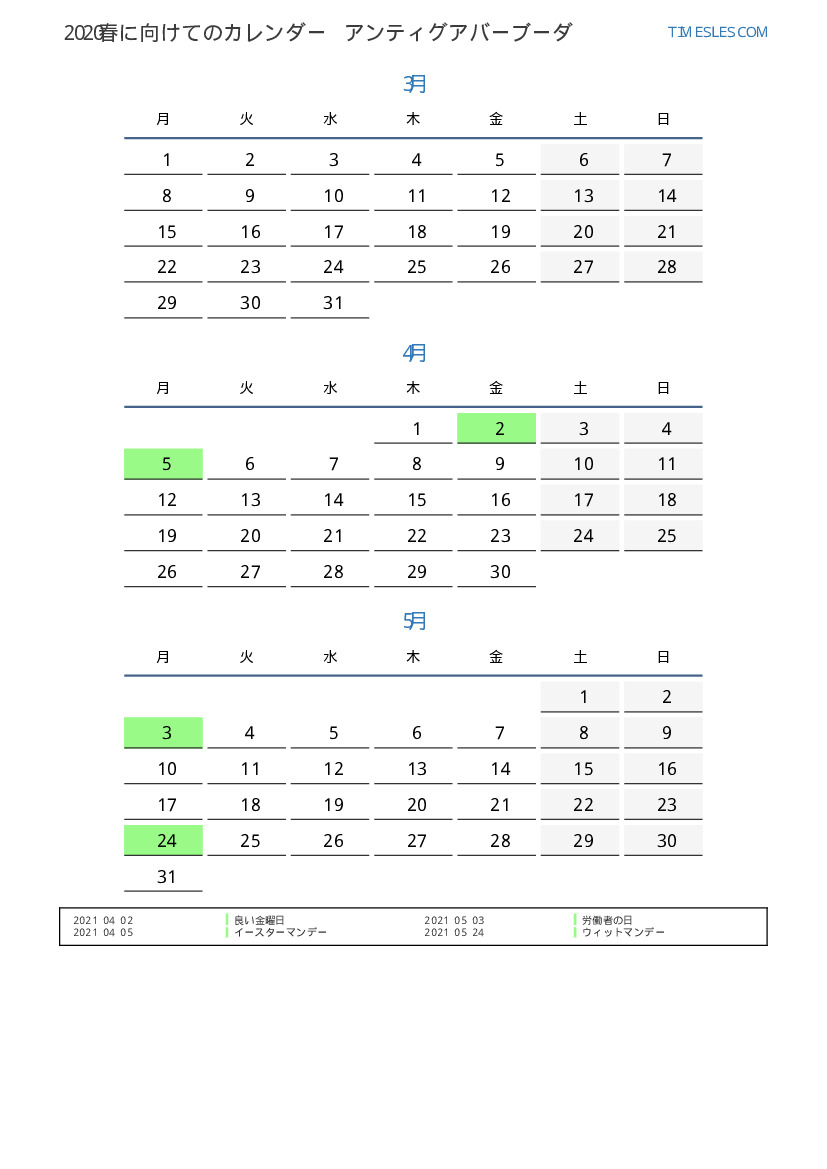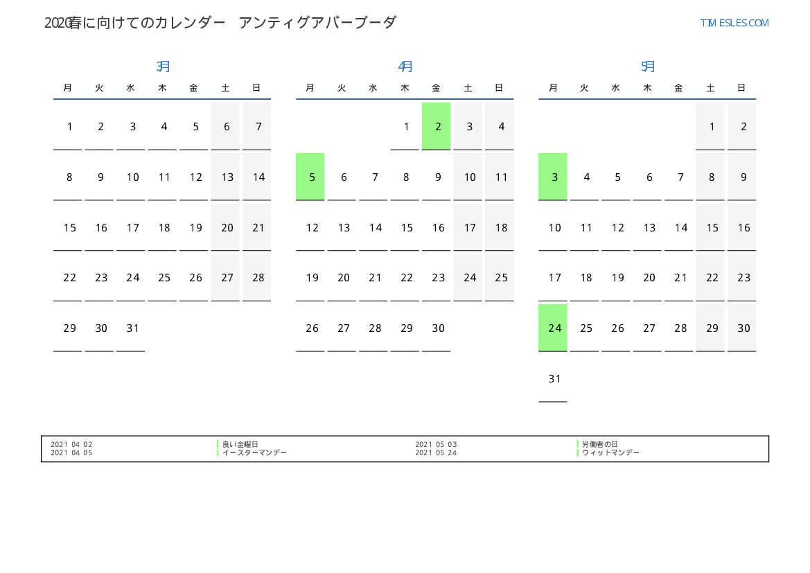 アンティグアバーブーダ2021年春に向けてのカレンダー