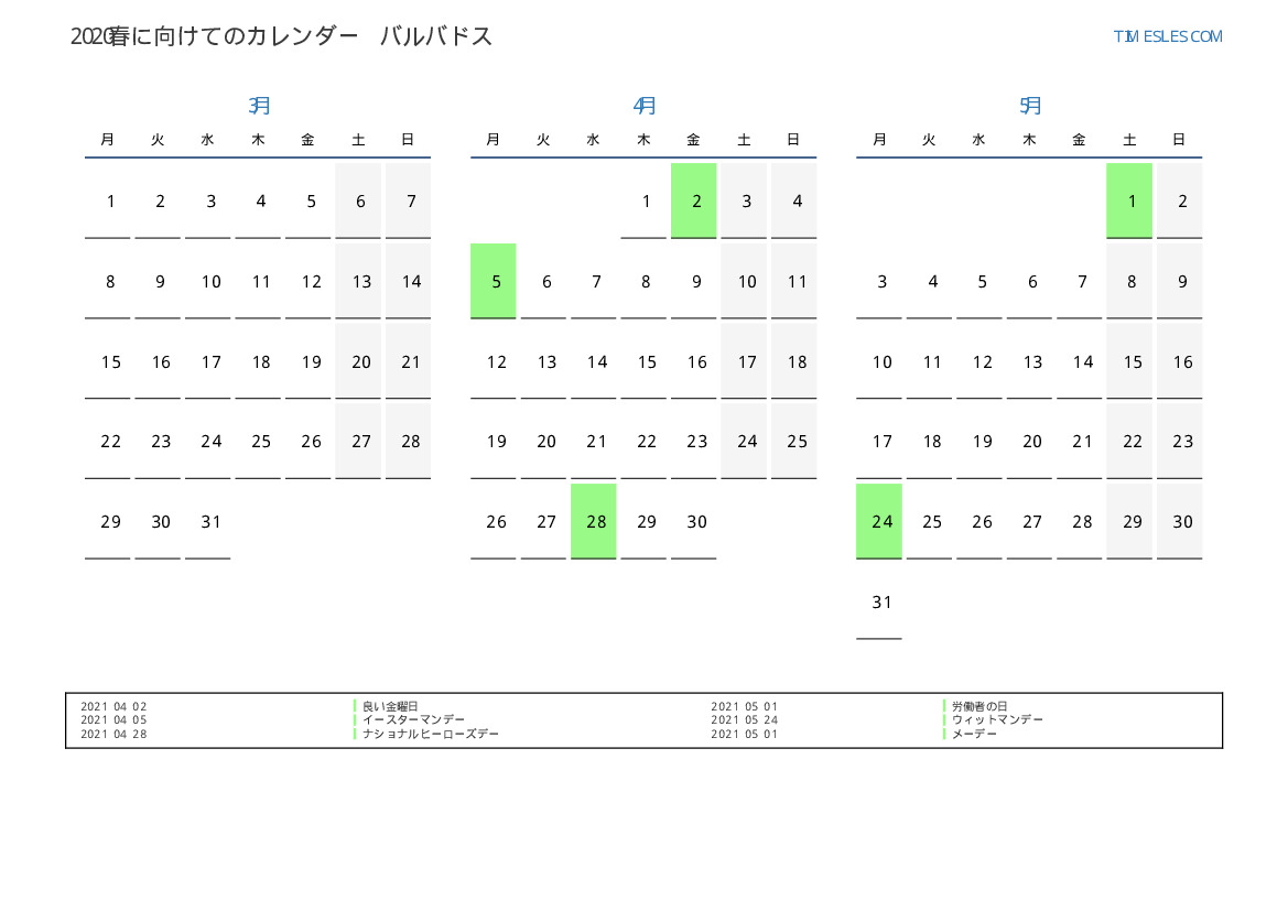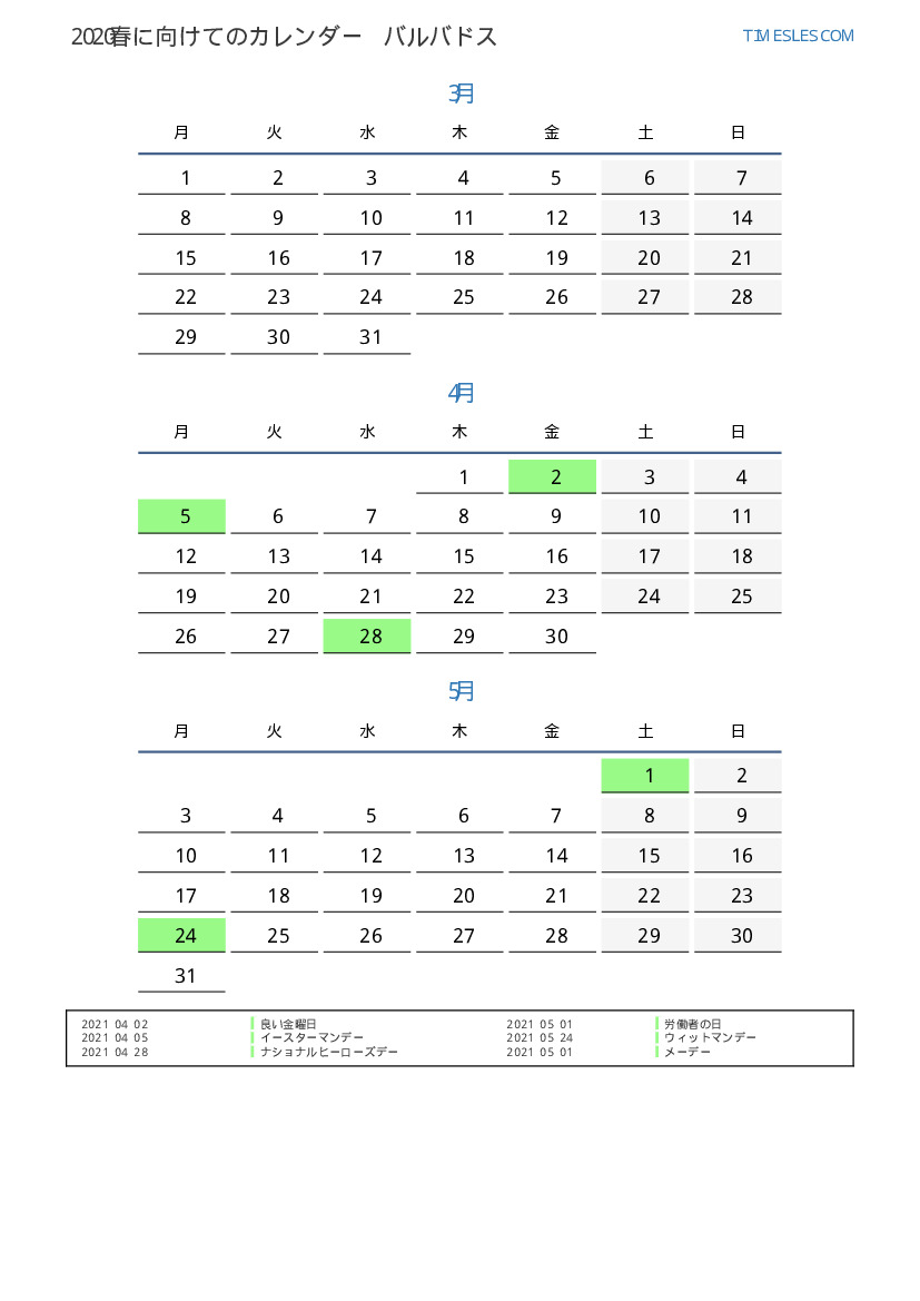 バルバドスのために2021春に向けての休日と週末のPDFカレンダーをダウンロードして印刷します