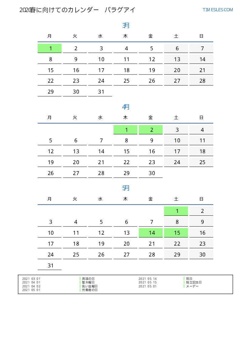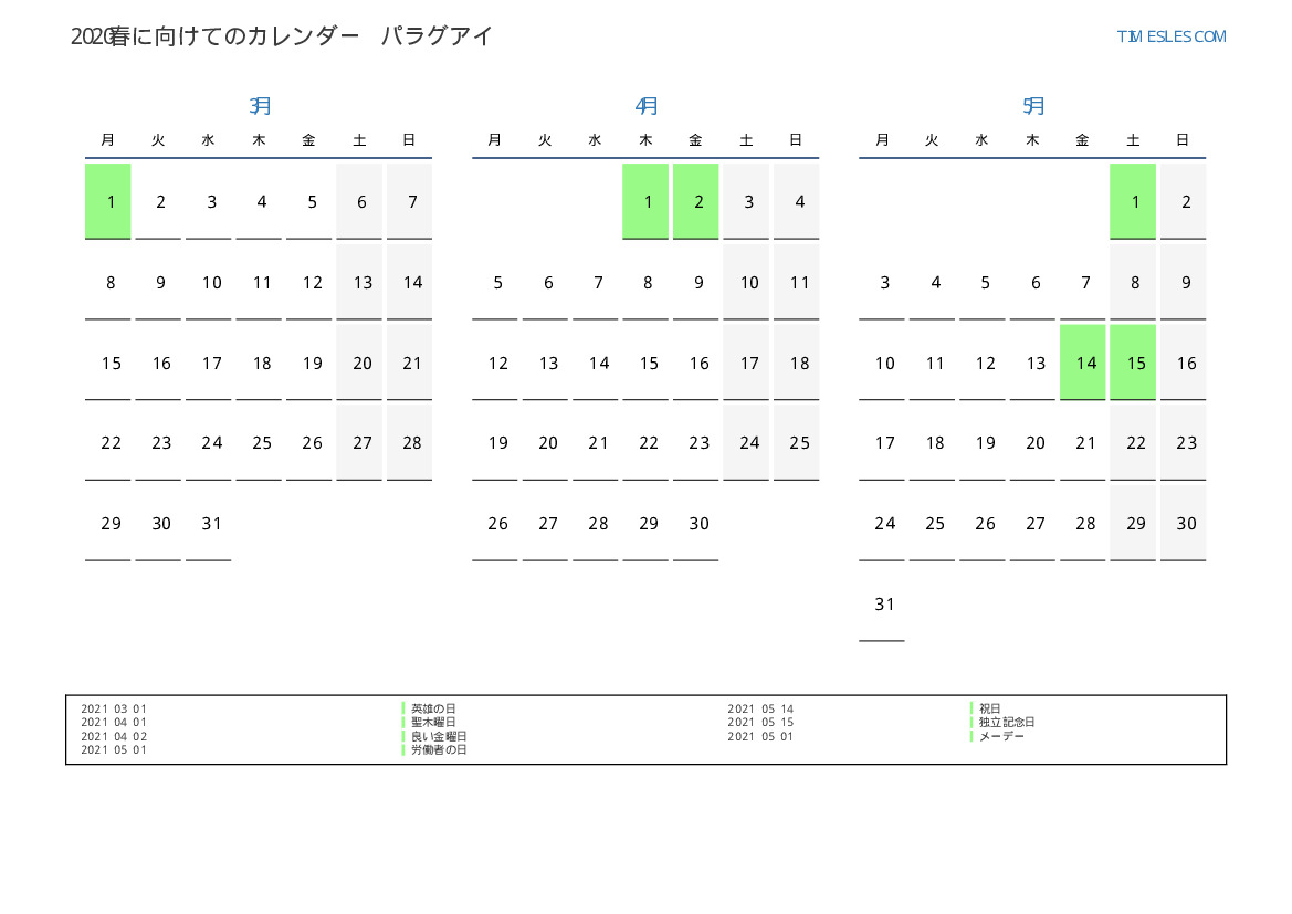 パラグアイ向け2021春に向けての休日と週末のカレンダー