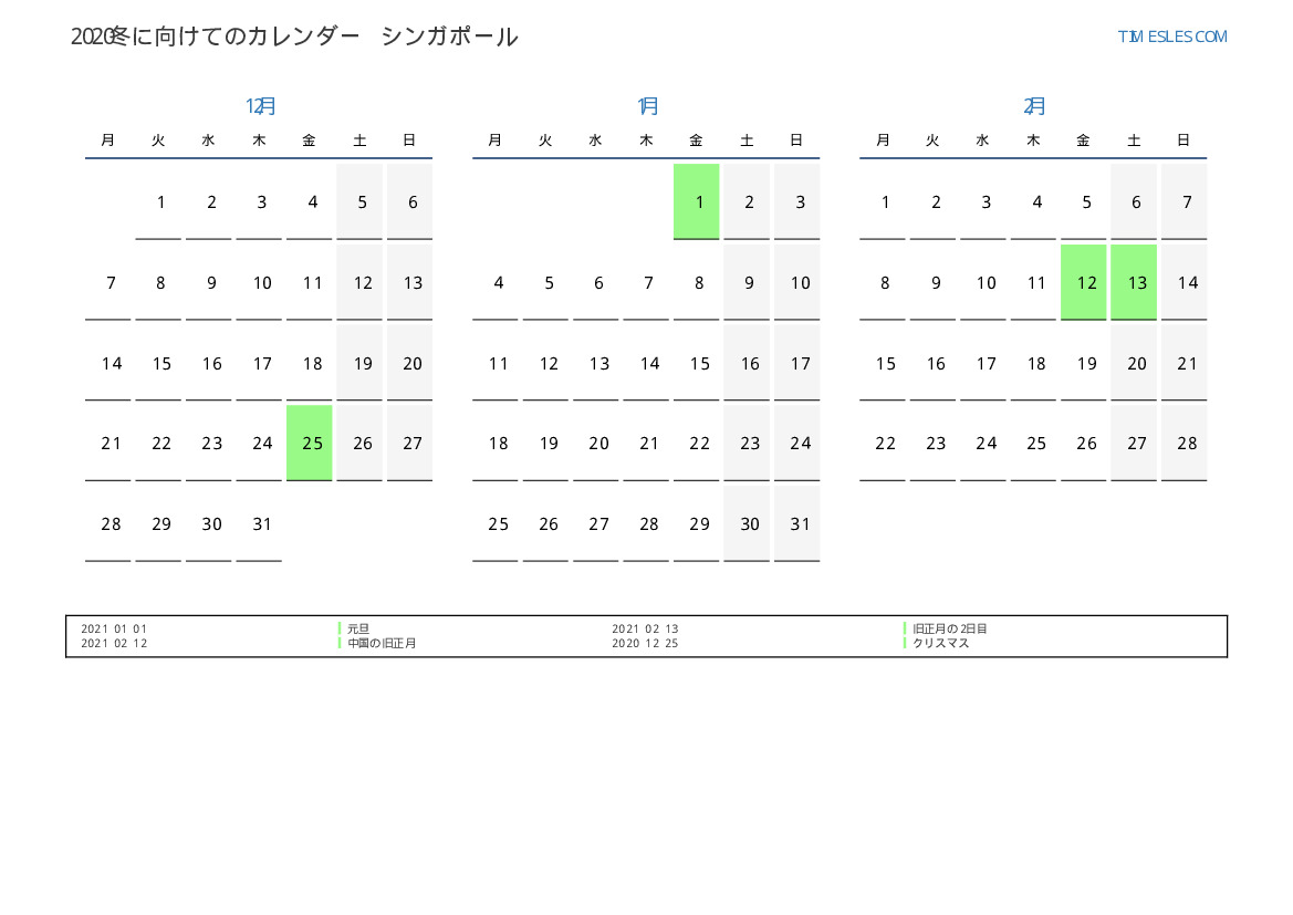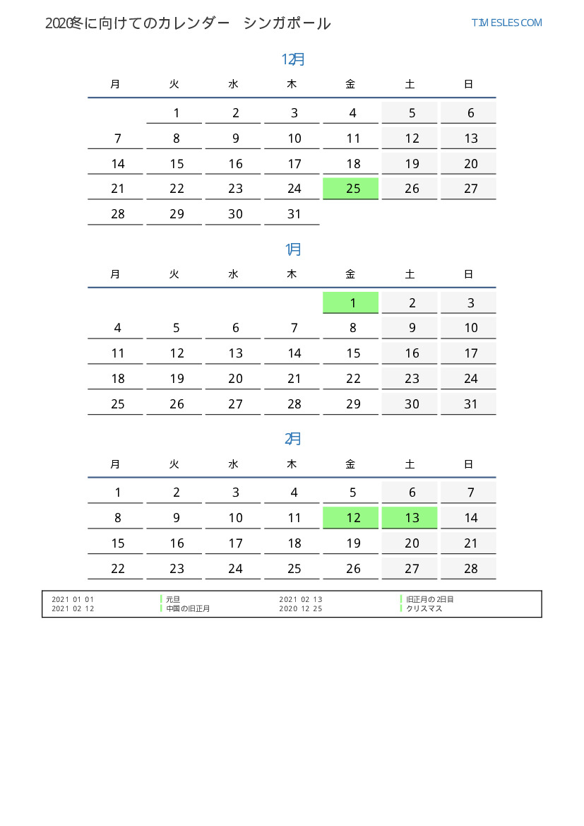 シンガポール向け2021春に向けての休日と週末のカレンダー